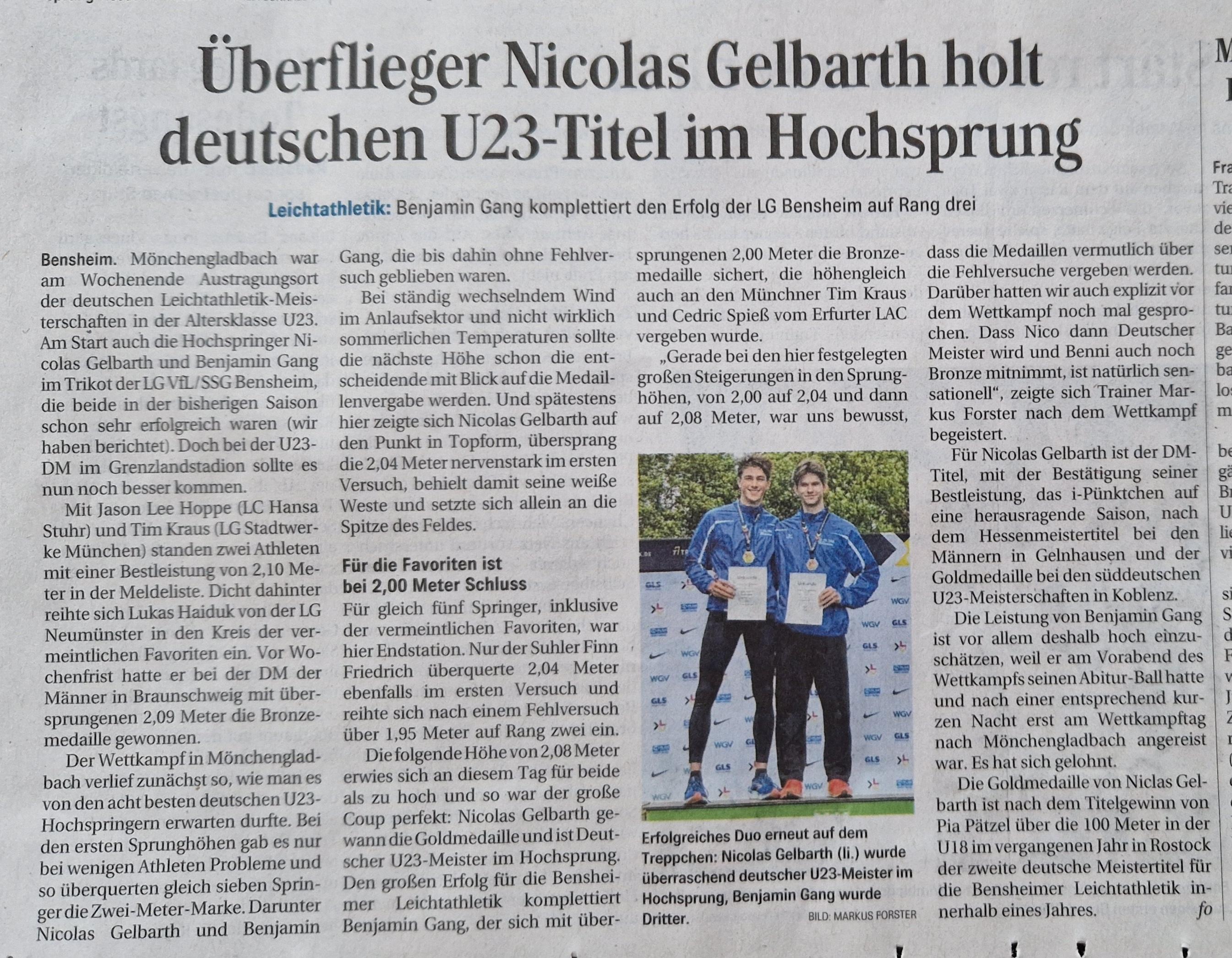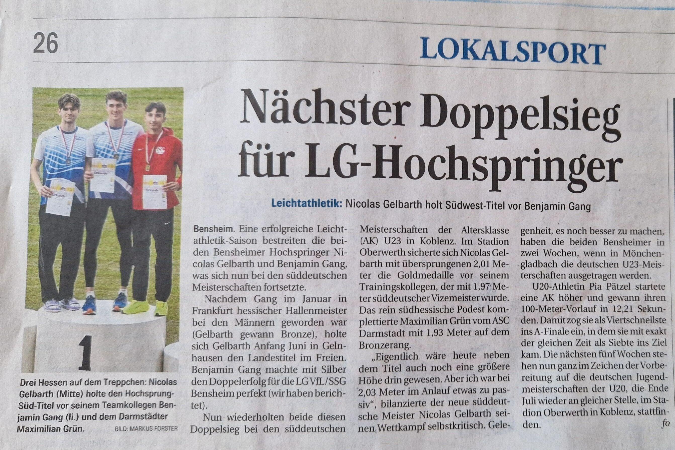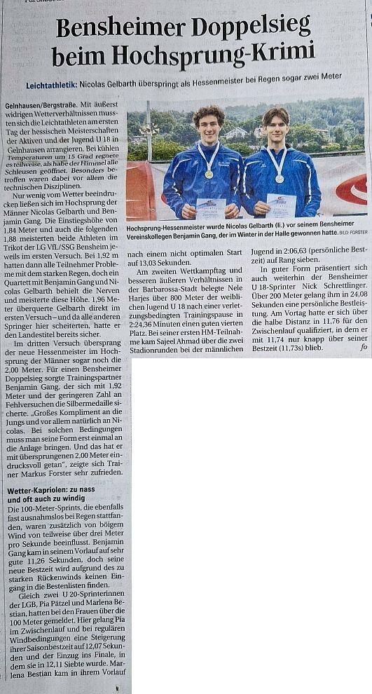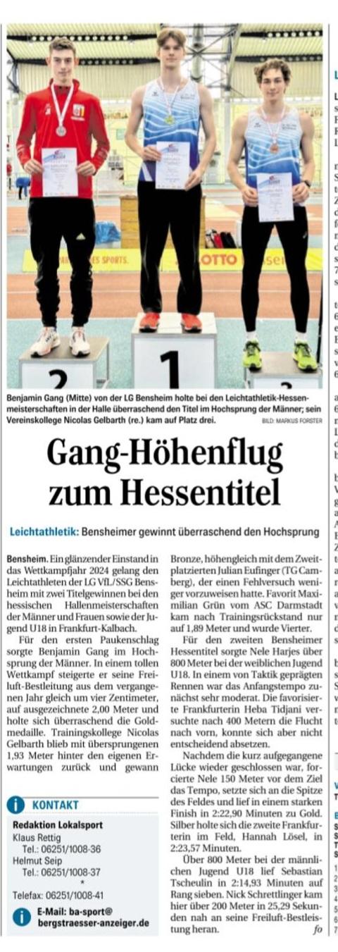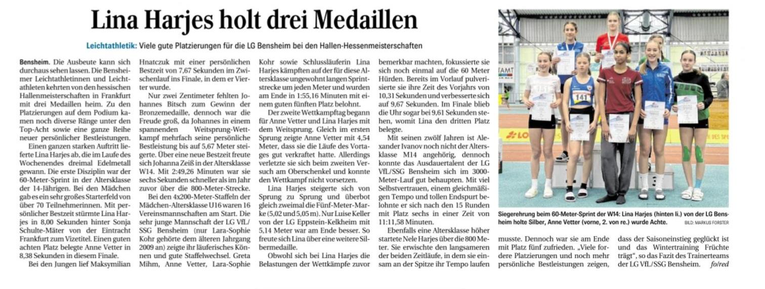 Bei den Süddeutschen Meisterschaften der U23 waren die Hochspringer Nicolas Gelbarth auf Platz 1 und Benjamin Gang auf Platz 2 erfolgreich. Den Dritten Platz der Süddeutschen Meisterschaft im Hochsprung der Herren sicherte sich Benjamin Gang mit neuem Vereinsrekord von 2,08 Metern. Hessicher Meister bzw. Hessische Meisterin wurden Benjamin Gang, Hochsprung Männer (Halle) - Nele Harjes, 800 Meter WU18 (Halle) & 800 Meter WU20 - Nicolas Gelbarth, Hochsprung Männer - Lina Harjes, Vierkampf & Siebenkampf W14 - Elisabeth Sattler, Cross W12 und die Mannschaft der LG Bensheim (Elisabeth Sattler, Alisa Krafft, Carolin Streng), Cross WU14. Zweite Plätze bei Hessischen Meisterschaften erreichten Lina Harjes, 60 Meter & Weitsprung W14 (Halle) - Benjamin Gang, Hochsprung Männer - Johannes Bitsch, Blockmehrkampf, Kugelstoßen M14 und Lennox Veith, Speerwurf M15. Über eine Bronze Medaille durften sich Nicolas Gelbarth, Hochsprung Männer (Halle) - Lina Harjes, 60 Meter Hürden W14 (Halle) & 100 Meter W14 - Carolin Streng, Blockmehrkampf W13 - Maksymilian Hnatczuk, 100 Meter M14 und Stephan Rapp, Cross M50 freuen. Abschließend ist noch der neue Hessenrekord über 800 Meter von Ines Harjes in der Altersklasse W45 zu erwähnen.