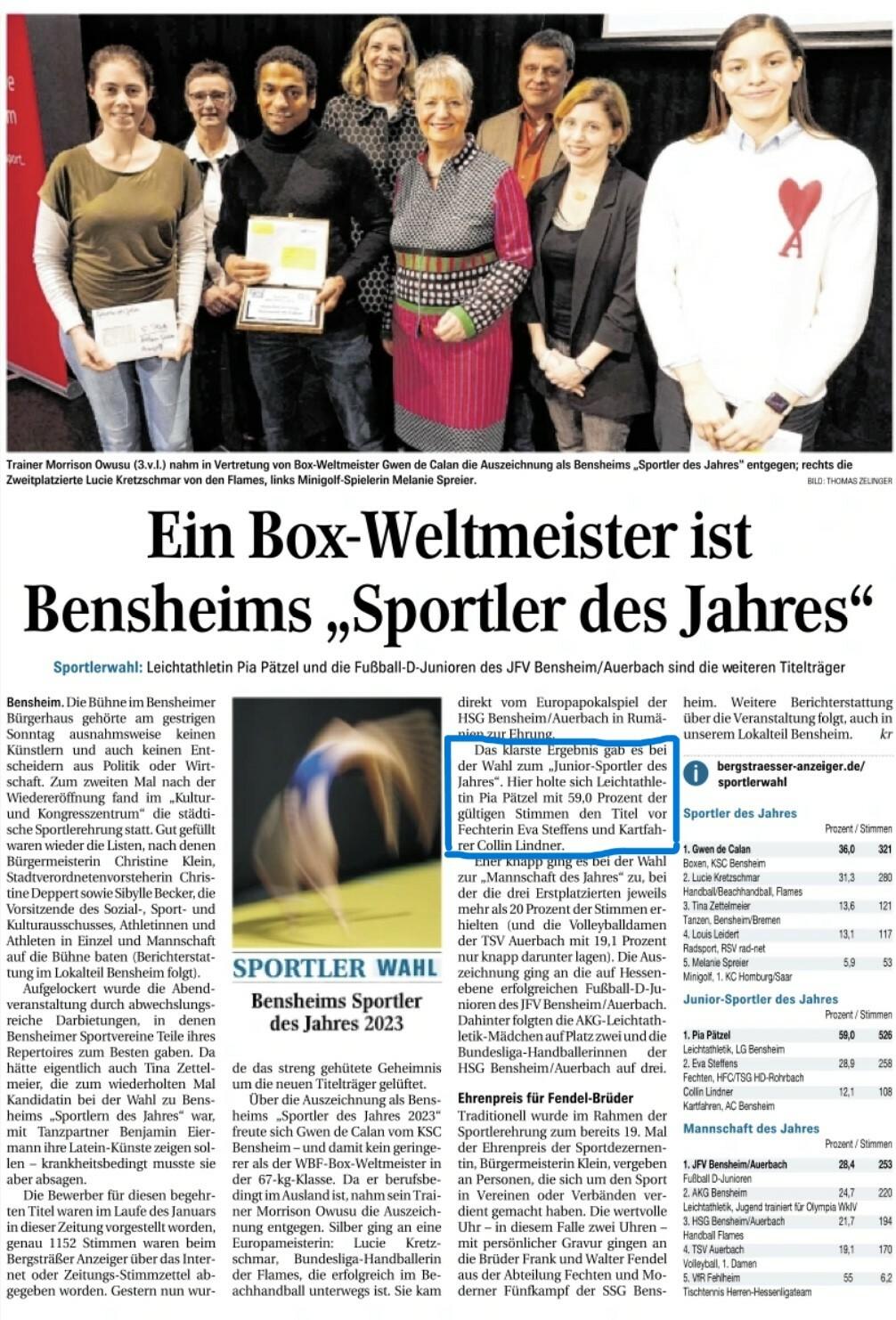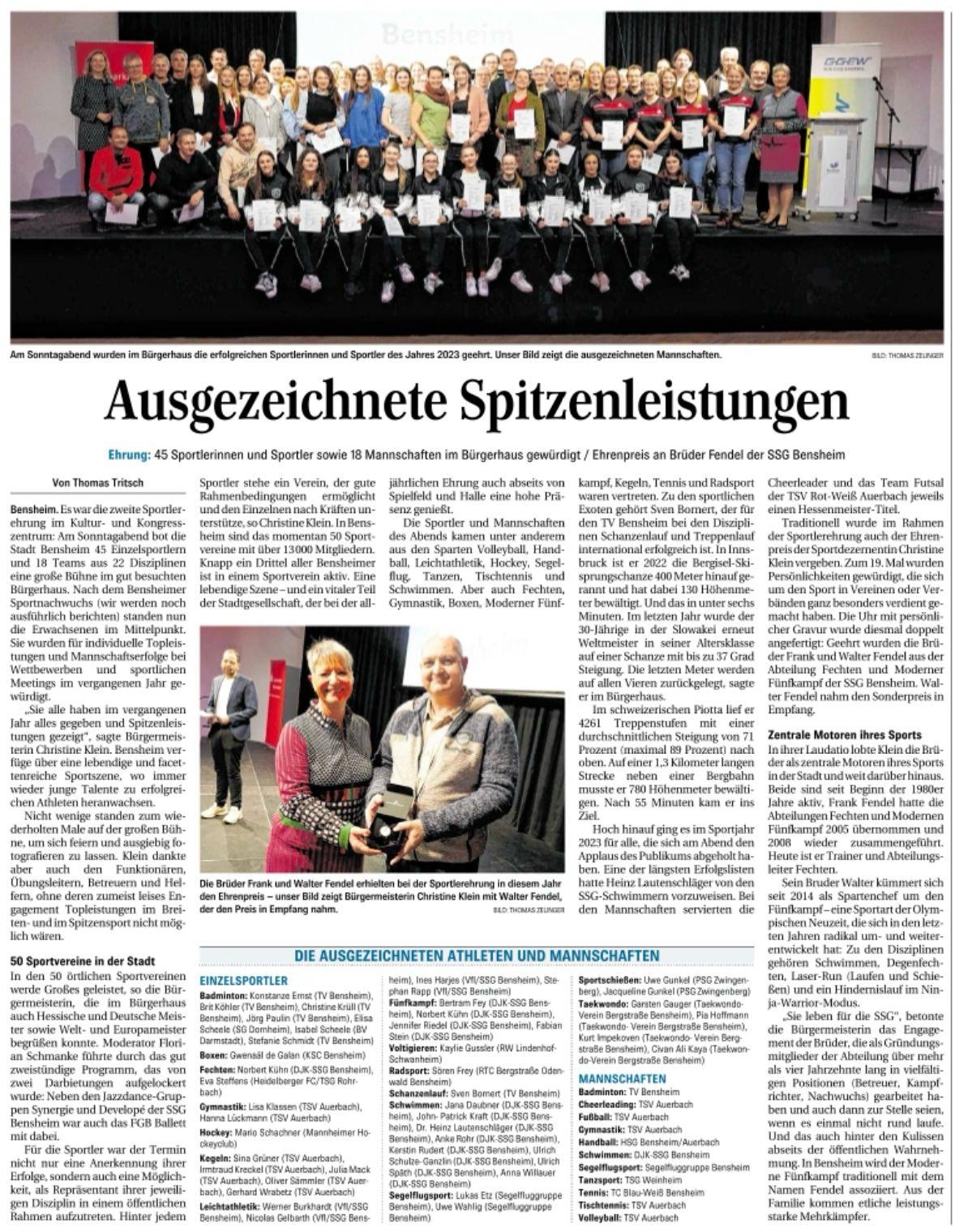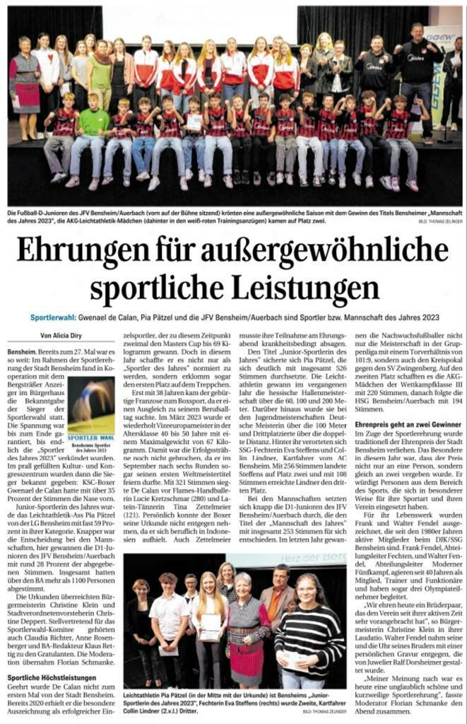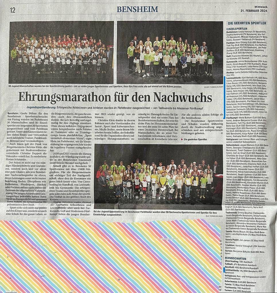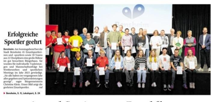 Der "Bergsträßer Anzeiger" veröffentlichte am 20.02.2024 nachfolgende Bilder und Berichte über die Sportlerehrung der Aktiven (Erwachsenen). Die Bilder und Berichte stammen aus der digitalen Ausgabe des BA (Titelseite, Lokalteil Bensheim, Lokalsport).