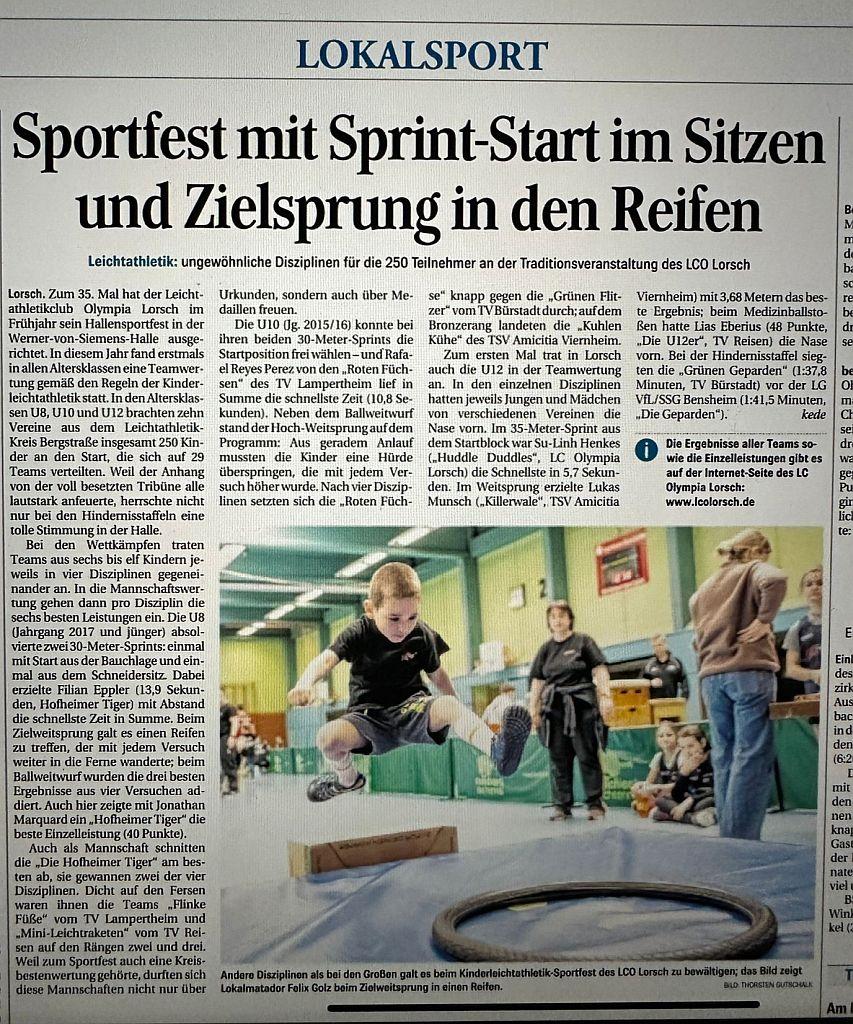 Am Sonntag, den 17.03.2024 richtete der LCO Lorsch die Hallenkreismeisterschaften der Kinderleichtathletik aus. Auch die LG VfL SSG Bensheim war mit einer jungen Mannschaft in der U12 vertreten.