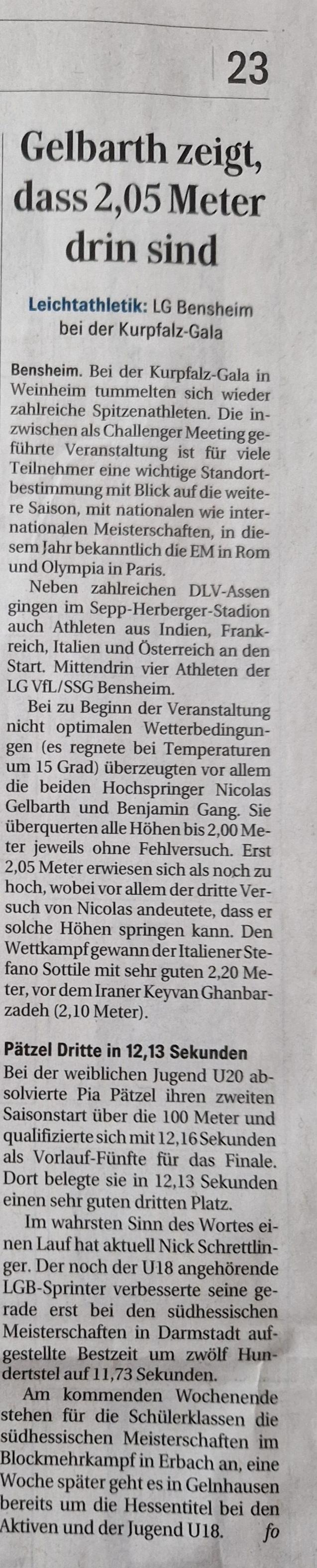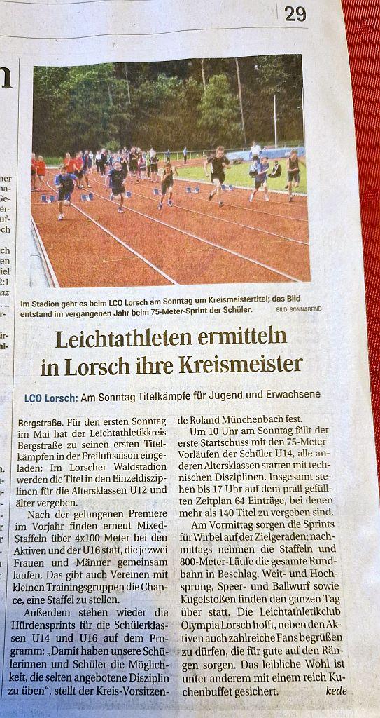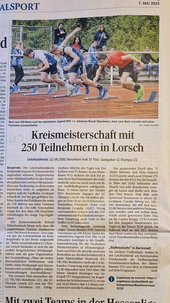Weiter geht es mit Wettkämpfen am 01.05. (Bahneröffnung in Viernheim) und am 05.05. mit den Kreismeisterschaften in Lorsch. Auch hier sind wieder viele Sportlerinnen und Sportler der LG VfL/SSG Bensheim im Einsatz. (sk)