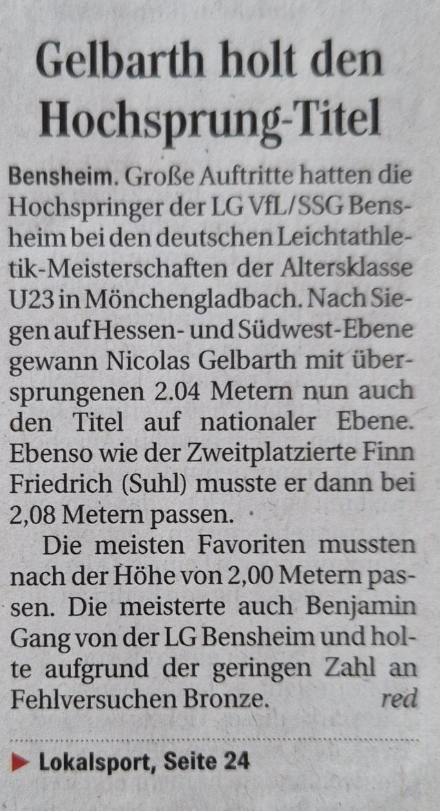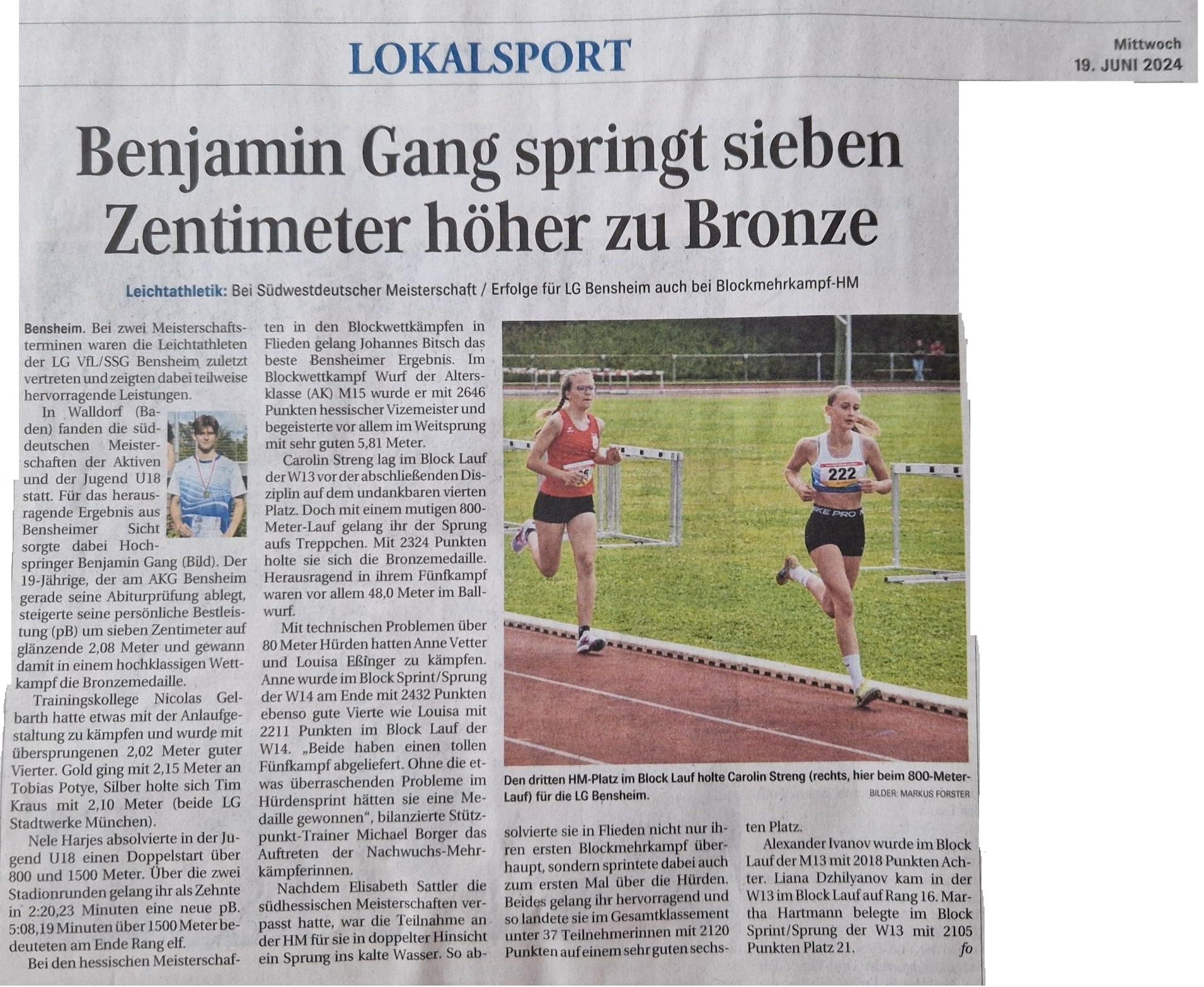 Am 24.08.2024 richtete der TV Bürstadt sein Sommersportfest aus. Einziger Teilnehmer der LG VfL/SSG Bensheim war Benjamin Gang, der im Hochsprung an den Start ging. Der Wettbewerb wurde mit allen Teilnehmern gemeinsam durchgeführt, was für Benjamin und Jacob Thomä (Frankfurt) eine lange Wartezeit bedeutete. Am Ende stand für Benjamin eine übersprungene Höhe von 2,00 Metern und der 1. Platz. Da er als Gewinner die Höhe von 2,00 Metern übersprang durfte er sich über eine Siegprämie freuen. (sk)