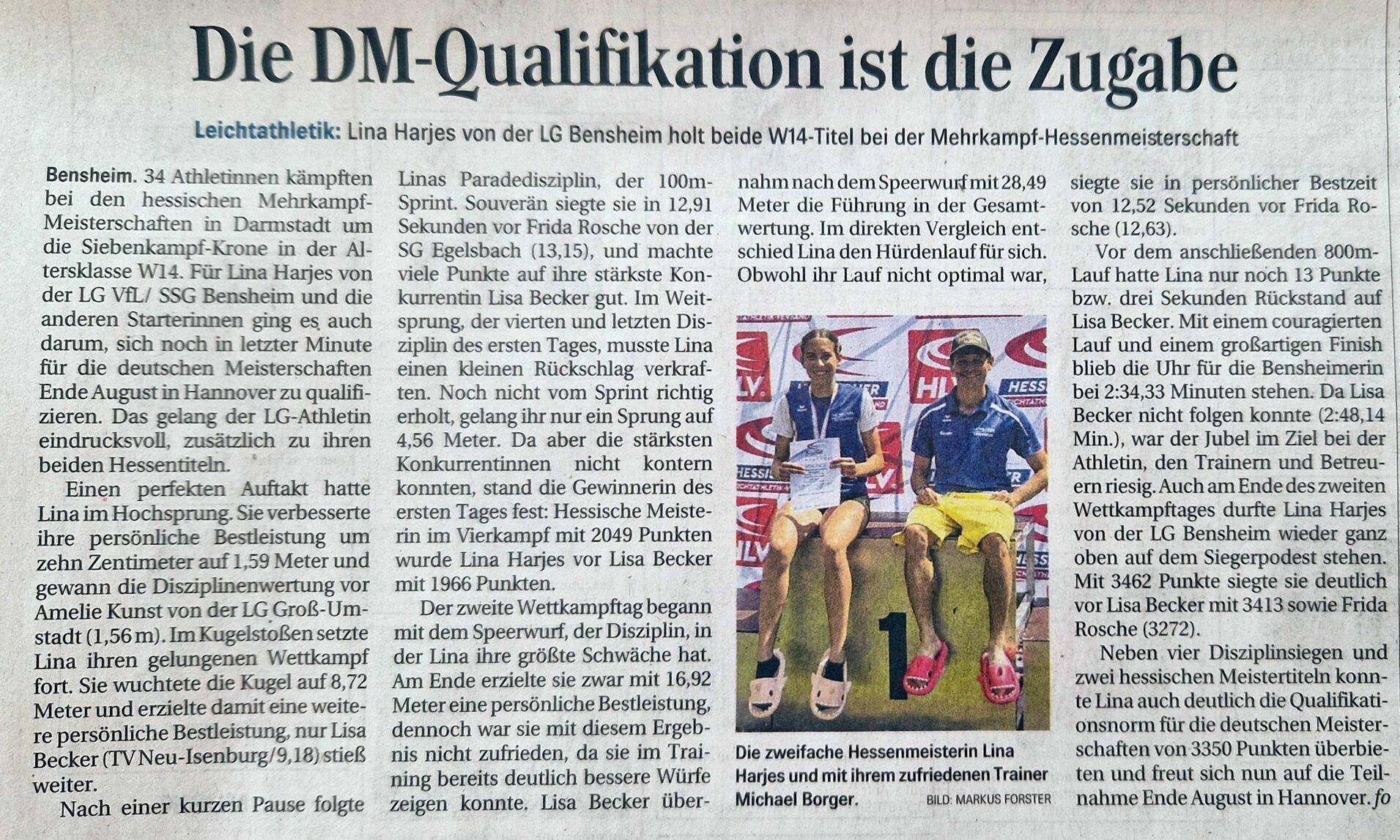 Am Wochenende vom 23.08. bis 25.08.2024 wurden die Deutschen Meisterschaften der Mehrkämpfer und Mehrkämpferinnen in Hannover ausgetragen. Die LG Athletin Lina Harjes hatte sich für diese Meisterschaften Anfang Juli qualifiziert und startete beim Siebenkampf der Weiblichen Jugend W14. Berits am Freitag standen mit 80 Meter Hürden, Hochsprung, Kugelstoßen und der 100 Meter Sprint die ersten vier Disziplinen auf dem Programm.