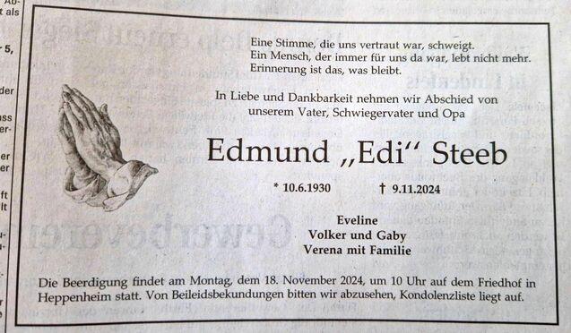 Mit großem Bedauern haben wir vom Tod unseres langjährigen Mitglieds Edmund Steeb erfahren ('Bergsträßer Anzeiger' 16.11.2024)
