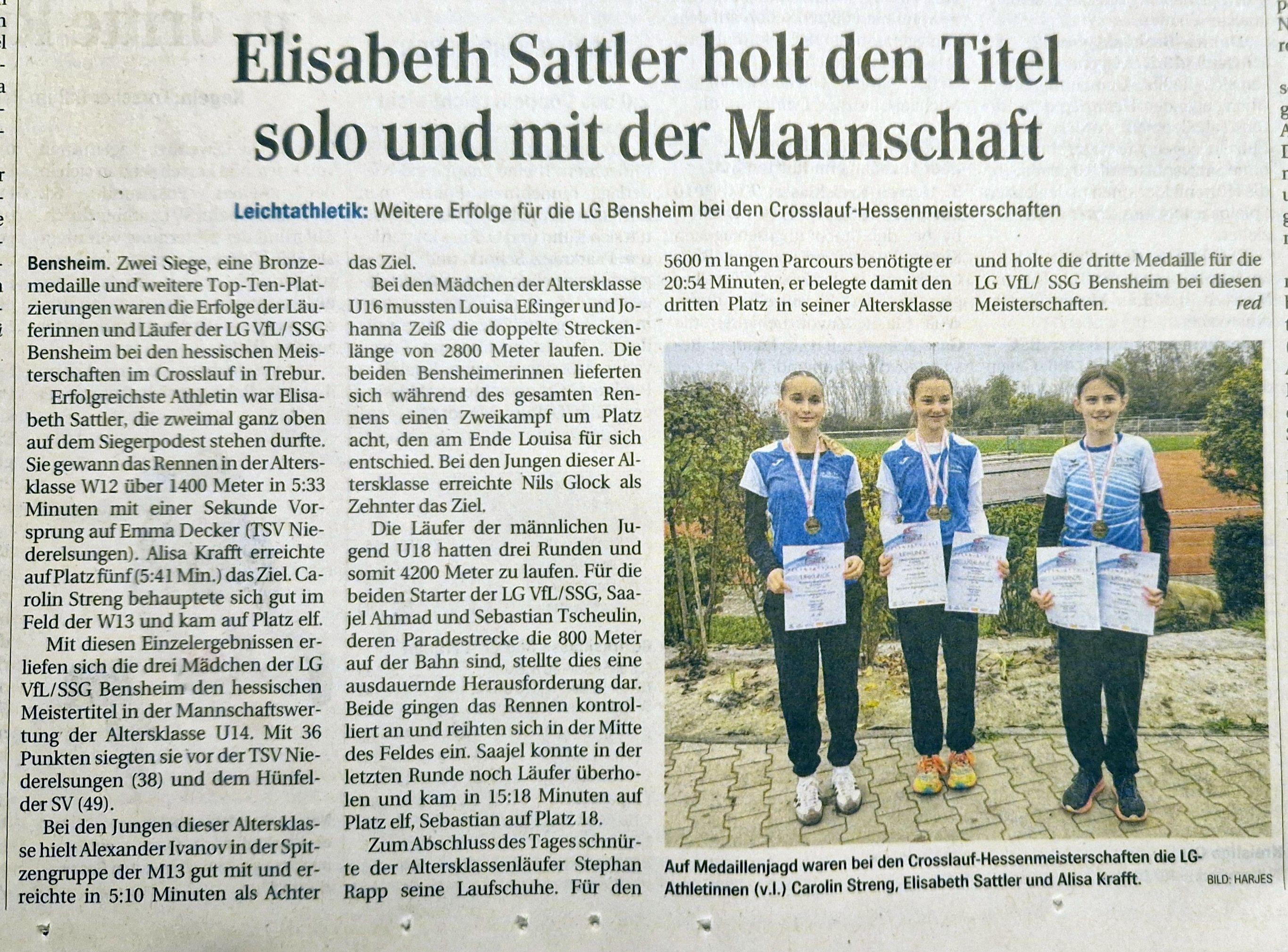 In einem starken Starterfeld war es für die LG Bensheim ein sehr erfolgreiches Wochenende. Mit zwei Hessen-Titeln für Elisabeth Sattler im Einzel und mit Alisa Krafft und Carolin Streng in der Mannschaft, sowie einer Bronze Medaille für Stephan Rapp, waren unsere Athletinnen und Athleten drei Mal auf dem Siegerpodest.