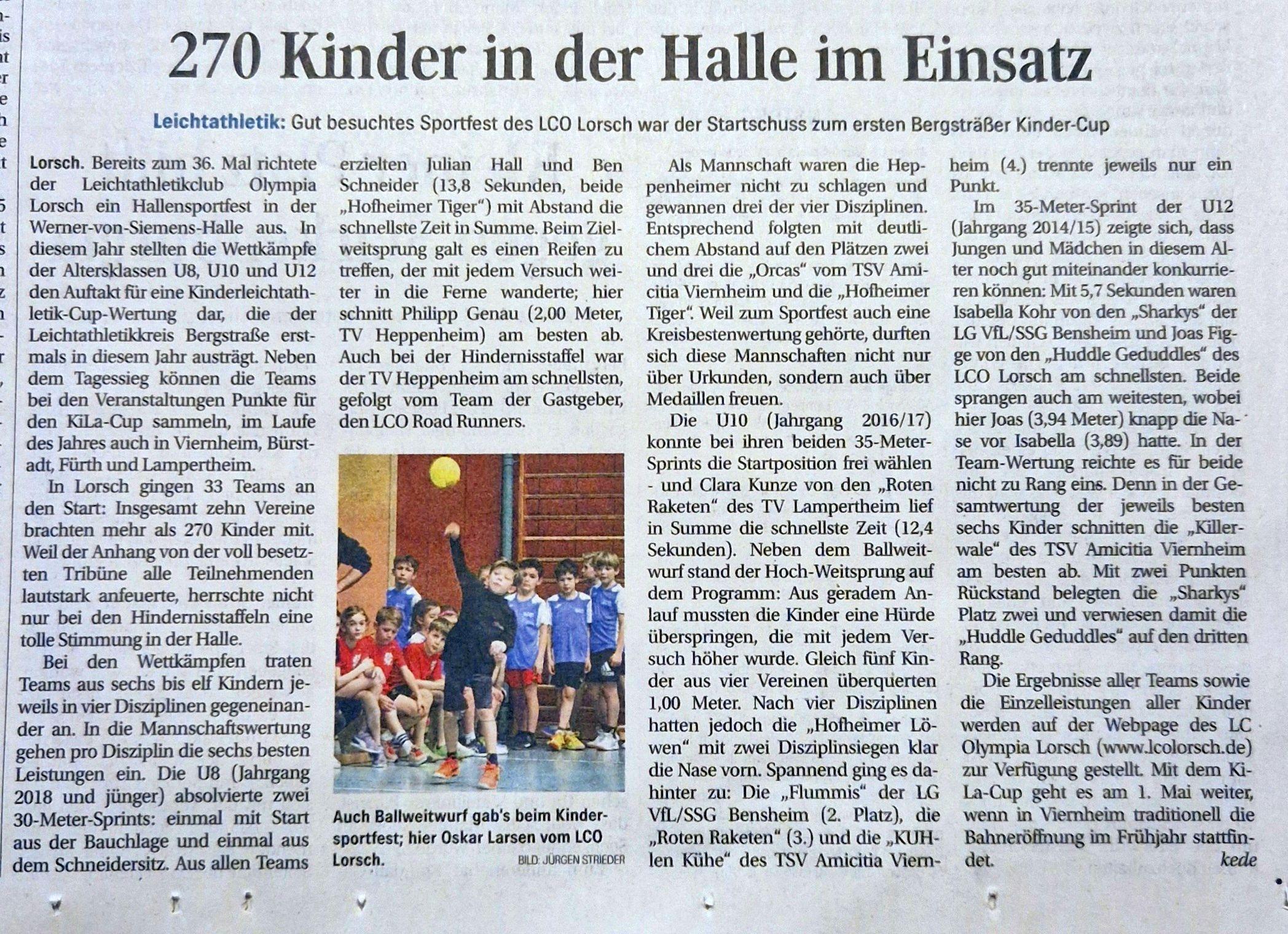 Die Kinderleichtathletik hatte am Sonntag dem 9. März ihren ersten Hallenwettkampf. Der LC Olympia Lorsch richtete das Hallensportfest mit Kreismeisterschaft in der Sporthalle der Werner von Siemens Schule aus. Bei den Team-Wettkämpfen treten Teams aus sechs bis elf Kindern in jeweils vier Disziplinen gegeneinander an. In die Mannschaftswertung gehen dann pro Disziplin die sechs besten Leistungen ein. Diese werden dann mit den Werten der anderen Mannschaft verglichen, um die jeweiligen Ranglistenpunkte zu ermitteln.In diesem Jahr waren die Starterfelder nicht nur sehr groß mit jeweils zwölf Mannschaften in den Altersklassen U10 und U12, sondern auch sehr ausgeglichen.