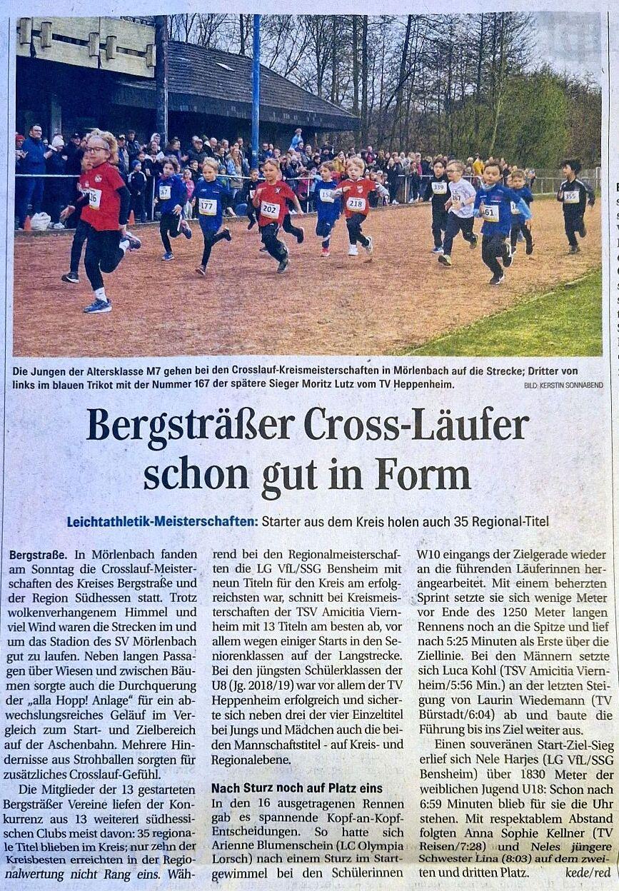 Am Sonntag den 23. Februar fanden in der Sporthalle in Frankfurt-Kalbach die offenen Kreis Hallenmeisterschaften des Leichtathletik-Kreises Hochtaunus statt. Aufgrund von Krankheit konnten die beiden Athletinnen Anne Vetter und Lina Harjes nur bedingt oder gar nicht bei den Hessischen Meisterschaften teilnehmen und nutzten die Möglichkeit am Sonntag in drei Disziplinen an den Start zu gehen. Beide Sportlerinnen starteten über die 60 Meter-Sprint-Strecke, den Weitsprung und im Kugelstoßen der Weiblichen Jugend U18 und erreichten folgende Resultate: 60 Meter Anne Vetter 8,20 (Vorlauf 1) Lina Harjes 8,07 (Vorlauf 3), sowie Anne 8,26 und Lina 8,04 (Finale). Im Weitsprung kam Anne auf 4,99 m und Lina 5,19 m. Im Kugelstoßen stieß Anne die 3-kg-Kugel auf 10,44 m und Lina auf 10,09 m. Betreut wurde die beiden Bensheimerinnen von Trainer Michael Borger.