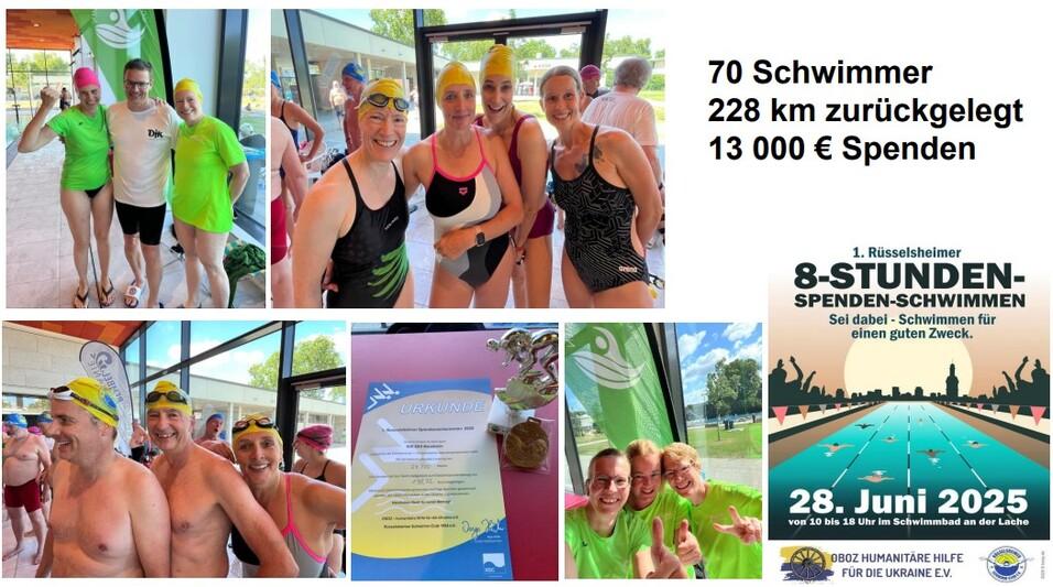 Ingesamt wurden zwischen 10 und 18 Uhr 228 km ezurückgelegt und damit 13.000 Euro für die humanitäre Hilfe in der Ukraine erschwommen, die dem gemeinnützigem Verein OBOZ e.V zugute kamen. „Es ist unglaublich ... wie viele Kilometer die Teilnehmer für die Menschen in der Ukraine geschwommen sind. … Dafür können wir wieder einen Krankenwagen in die Ukraine schicken“, Olga Byegunova, vom Oboz e.V Vorstand war sichtlich gerührt.
