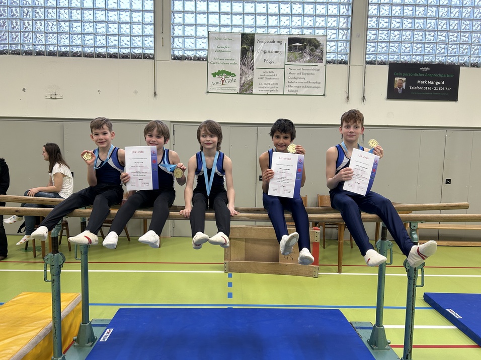 Im Qualifikationswettkampf der Jüngsten Jahrgang 2016 und jünger im Sechskampf P4 zeigte Moritz Geiß sein Können, er turnte mit 74,6 Punkten und an allen Geräten den Tageshöchstwert auf einen Podiumsplatz. Als Sieger konnte er sich für die Hessischen Meisterschaften qualifizieren.