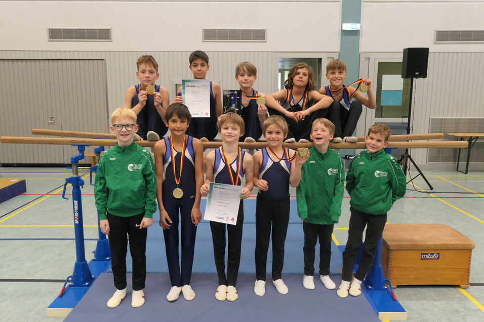 Bei den ganz jungen Turnern der Jahrgänge 2016 und jünger im Vierkampf P1 - P3 erturnten sich die beiden Turner zur großen Verwunderung der Trainer sehr gute Plätze. Julius Altenrath legte den Grundstein für sein Podiumsplatz schon gleich an seinem ersten Gerät dem Sprung mit 11,50 Punkten und belegte mit dem Gesamtergebnis von 43,05 Punkten den 3. Platz. Sein Teamkollege Henri Laubach zeigte ebenfalls sehr gute Übungen an den vier Geräten und belegte mit 42,60 Punkten den 4. Platz.