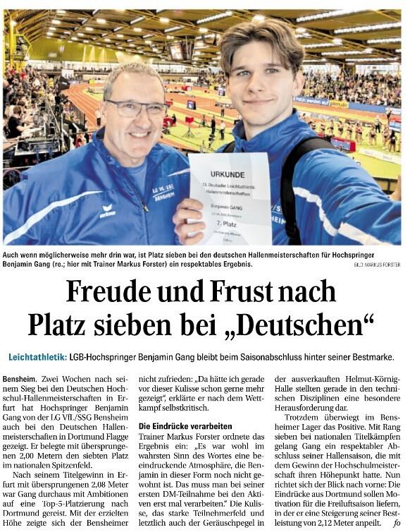 Eine Qualifikation mit A-Norm für eine Deutsche Meisterschaft ist bereits etwas Besonderes. Doch die tatsächliche Teilnahme an einer solchen Veranstaltung ist noch einmal eine ganz eigene Erfahrung. Diese durfte Hochspringer Benjamin Gang von der LG VfL/SSG Bensheim am Sonntag, dem 1. März, in der Helmut-Körnig-Halle in Dortmund machen. Schon der Ablauf unterscheidet sich deutlich von gewohnten Wettkämpfen. Während man sonst die Halle betritt, den Anlauf ausmisst, sich einspringt und der Wettkampf beginnt, ist eine Deutsche Hallenmeisterschaft ein echtes Event. Die Springer verlassen zunächst den Innenraum und werden anschließend einzeln aufgerufen. Unter der Vorstellung ihrer Namen und bisherigen Erfolge betreten sie durch einen separaten Einlauf die mit rund 4.000 Zuschauern ausverkaufte Halle. Der Weg führt durch einen inszenierten Lichtereingang mit farbig wechselnden LED-Elementen, die eine spektakuläre Atmosphäre schaffen. Rechts und links des Tunnels stehen Zuschauer – viele Kinder und Jugendliche – und strecken den Athleten die Hände zum Abklatschen entgegen. Spätestens hier wird deutlich: Das ist ein anderer Rahmen, eine andere Bühne, ein anderer Wettkampf. Gerade für jüngere Sportlerinnen und Sportler erfordert es ein hohes Maß an Konzentration, sich von dieser Kulisse nicht ablenken zu lassen und den Fokus auf die eigene Leistung zu richten. Auch sportlich unterscheidet sich eine Deutsche Meisterschaft vom gewohnten Ablauf. Der Hochsprungwettkampf begann bei einer Einstiegshöhe von 1,95 Metern – nicht wie sonst häufig bei 1,80 Metern oder 1,85 Metern. Das bedeutete, vom ersten Versuch an voll präsent zu sein und sich möglichst keine Fehlversuche zu leisten. Diese Herausforderung teilte Benjamin allerdings mit den meisten der übrigen Athleten im stark besetzten Starterfeld. Die 1,95 Meter stellten für Benjamin noch kein Problem dar. Bei 2,00 Metern benötigte er jedoch zwei Versuche. Und auch die Steigerungen erfolgen bei Deutschen Meisterschaften in größeren Schritten: Auf 2,00 Meter folgten direkt 2,05 Meter. Hier fand Benjamin an diesem Tag leider nicht den entscheidenden Rhythmus. Während die 2,00 Meter noch souverän wirkten, gelangen ihm über 2,05 Meter keine wirklich überzeugenden Versuche. Hinzu kam die besondere Atmosphäre in der Halle: Direkt neben dem Hochsprung absolvierte Olympiasiegerin Malaika Mihambo ihre Versuche im Weitsprung – begleitet von lautstarker Unterstützung der 4.000 Zuschauer. Eine Geräuschkulisse, die man in dieser Form nicht alle Tage erlebt. Die 2,05 Meter wären an einem optimalen Tag sicherlich möglich gewesen, doch die Plätze eins bis drei waren an diesem Wochenende außer Reichweite. Besonders der spätere Sieger Falk Wendrich überzeugte mit starken übersprungenen 2,19 Metern. Am Ende standen für Trainer Markus Forster und Benjamin Gang Platz sieben sowie vor allem die wertvolle Erfahrung einer Deutschen Meisterschaft – und ein besonderer Wettkampftag in einer außergewöhnlichen Atmosphäre.