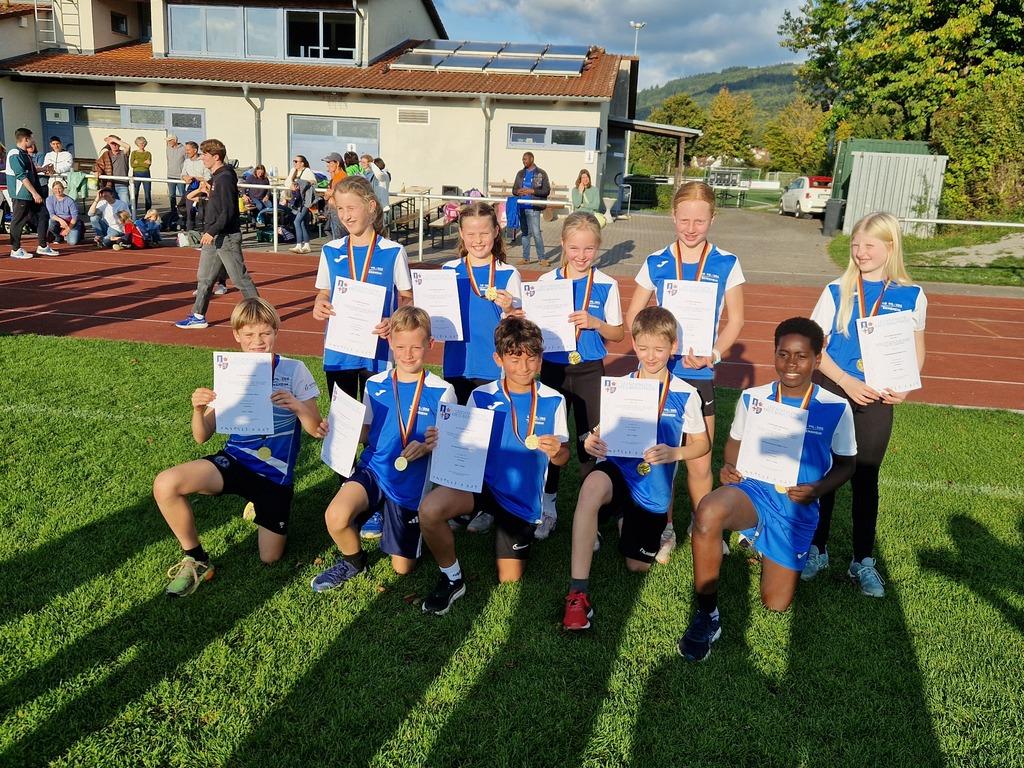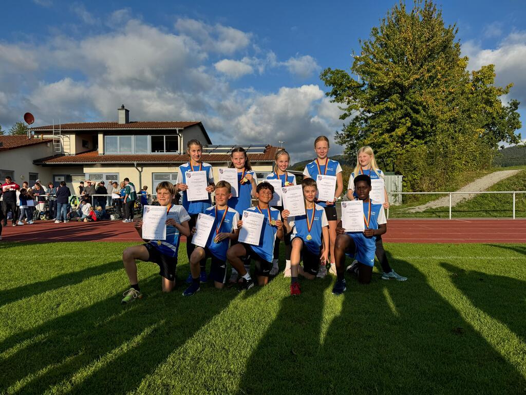Für die U10 gingen Frida Brehm, Pauline Dorn, Ava Klose, Livia Rehberg, Peter Schum, Mattis Schumacher und Joshua Unfried als „Falken“ ins Rennen. Den Auftakt bildete die Hindernissprint-Staffel: Im Wechsel mussten die Kinder über vier Kisten sprinten, wobei jeder Umwurf Strafpunkte brachte. Danach folgte der 40-m-Sprint, den jede Athletin und jeder Athlet zweimal absolvierte; die addierten Zeiten ergaben das Ergebnis. Im anschließenden Weitsprung standen vier Versuche zur Verfügung, die drei besten kamen in die Wertung. Danach ging es zum Medizinballstoßen: Mit dem 2-kg-Ball hatten alle zweimal zwei Versuche, auch hier wurden die drei besten gezählt. Zum Abschluss wartete die Biathlon-Staffel, bei der nach einer Laufrunde zwei Wasserflaschen mit Schlagbällen getroffen werden mussten. Bei Fehlwürfen waren Strafrunden um die Weitsprunggrube fällig. Mit großem Einsatz belegten die „Falken“ am Ende einen starken zweiten Platz und holten sich verdient die Vizekreismeisterschaft.