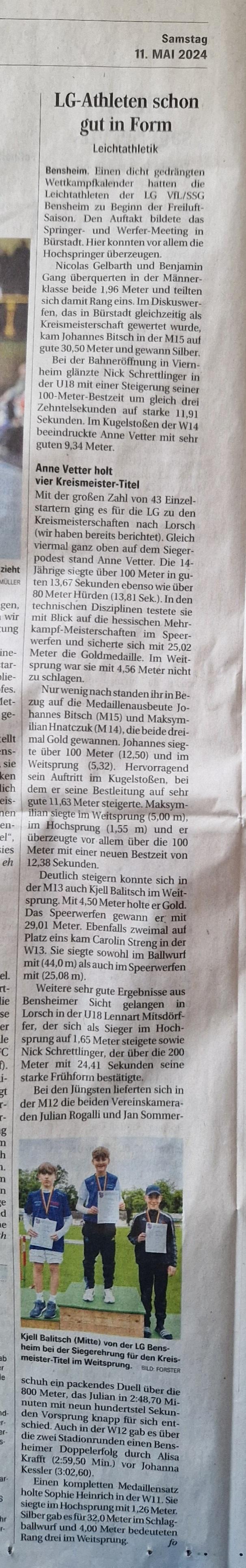 Weiter geht es mit Wettkämpfen am 01.05. (Bahneröffnung in Viernheim) und am 05.05. mit den Kreismeisterschaften in Lorsch. Auch hier sind wieder viele Sportlerinnen und Sportler der LG VfL/SSG Bensheim im Einsatz. (sk)