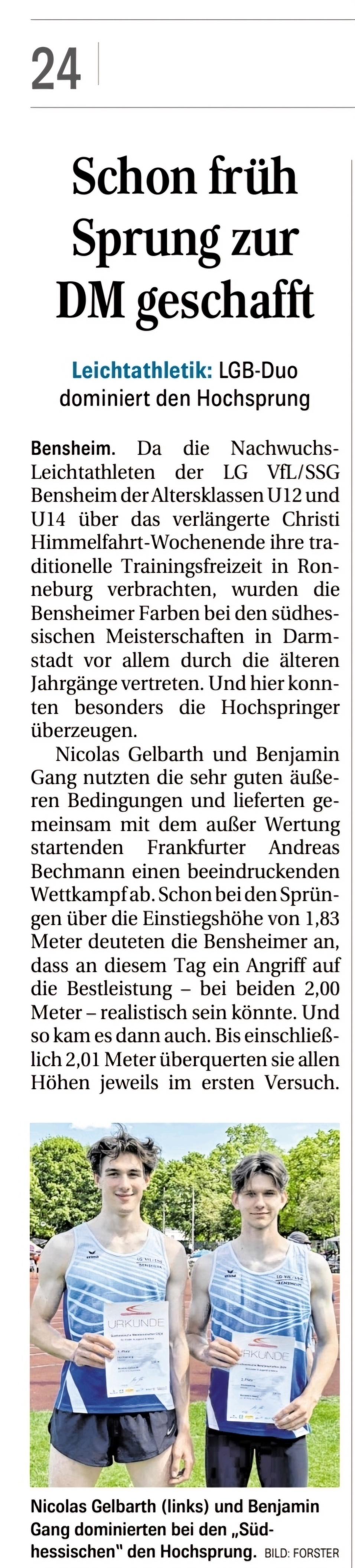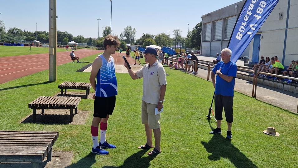 Am 24.08.2024 richtete der TV Bürstadt sein Sommersportfest aus. Einziger Teilnehmer der LG VfL/SSG Bensheim war Benjamin Gang, der im Hochsprung an den Start ging. Der Wettbewerb wurde mit allen Teilnehmern gemeinsam durchgeführt, was für Benjamin und Jacob Thomä (Frankfurt) eine lange Wartezeit bedeutete. Am Ende stand für Benjamin eine übersprungene Höhe von 2,00 Metern und der 1. Platz. Da er als Gewinner die Höhe von 2,00 Metern übersprang durfte er sich über eine Siegprämie freuen. (sk)