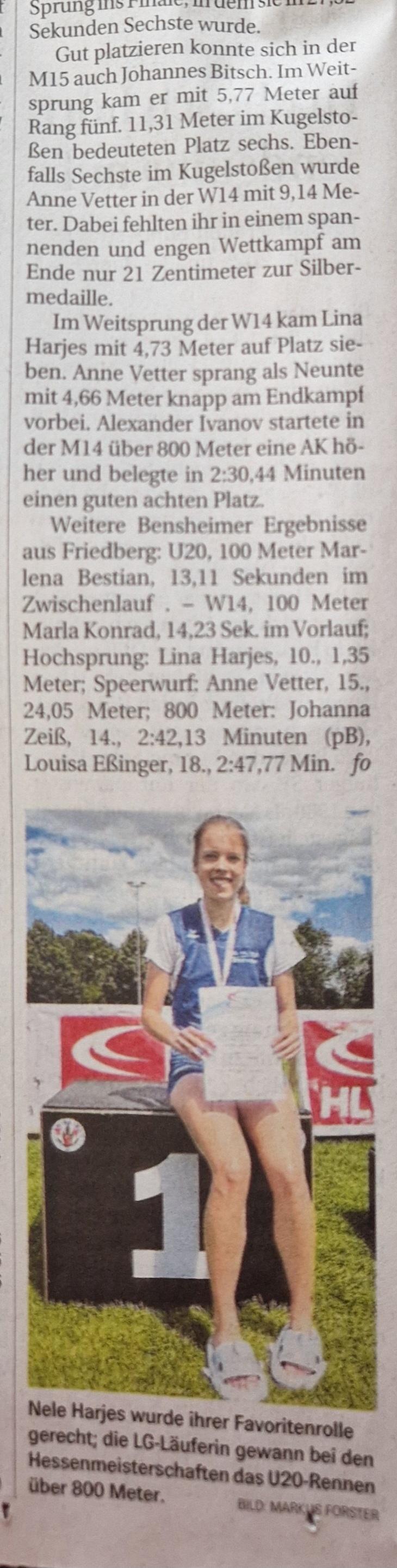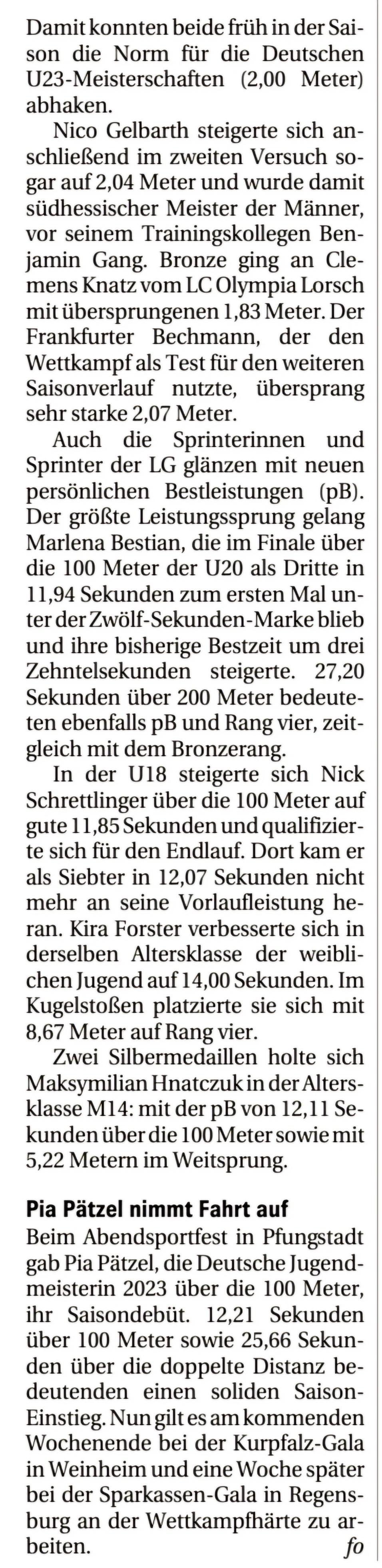 Bei den Süddeutschen Meisterschaften der U23 waren die Hochspringer Nicolas Gelbarth auf Platz 1 und Benjamin Gang auf Platz 2 erfolgreich. Den Dritten Platz der Süddeutschen Meisterschaft im Hochsprung der Herren sicherte sich Benjamin Gang mit neuem Vereinsrekord von 2,08 Metern. Hessicher Meister bzw. Hessische Meisterin wurden Benjamin Gang, Hochsprung Männer (Halle) - Nele Harjes, 800 Meter WU18 (Halle) & 800 Meter WU20 - Nicolas Gelbarth, Hochsprung Männer - Lina Harjes, Vierkampf & Siebenkampf W14 - Elisabeth Sattler, Cross W12 und die Mannschaft der LG Bensheim (Elisabeth Sattler, Alisa Krafft, Carolin Streng), Cross WU14. Zweite Plätze bei Hessischen Meisterschaften erreichten Lina Harjes, 60 Meter & Weitsprung W14 (Halle) - Benjamin Gang, Hochsprung Männer - Johannes Bitsch, Blockmehrkampf, Kugelstoßen M14 und Lennox Veith, Speerwurf M15. Über eine Bronze Medaille durften sich Nicolas Gelbarth, Hochsprung Männer (Halle) - Lina Harjes, 60 Meter Hürden W14 (Halle) & 100 Meter W14 - Carolin Streng, Blockmehrkampf W13 - Maksymilian Hnatczuk, 100 Meter M14 und Stephan Rapp, Cross M50 freuen. Abschließend ist noch der neue Hessenrekord über 800 Meter von Ines Harjes in der Altersklasse W45 zu erwähnen.