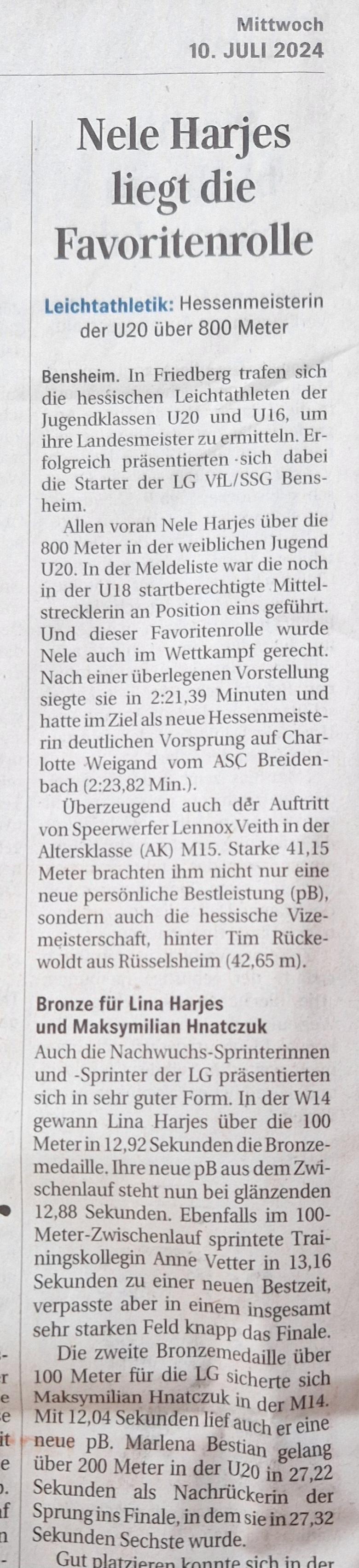 Am Ende der Wettkampfsaison 2024 stand am 04. September noch das 4. Pfungstädter Abendsportfest an. Einzige Teilnehmerin der LG VfL/SSG Bensheim war Nele Harjes über die 1.500 Meter der Altersklasse U18. Mit einer Zeit von 4:49,98 Minuten wurde Nele, mit 32 Hundertstel Sekunden Rückstand auf Platz 2 aller Teilnehmerinnen, sehr gute Dritte. In der Altersklasse U18 wurde errang sie Platz 1. Die 4:49,98 Munuten bedeuteten aber auch eine neue persönliche Bestleistung und die Verbesserung des eigenen LG-Vereinsrekords. (sk)