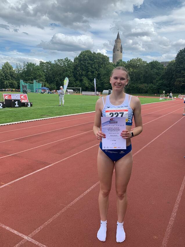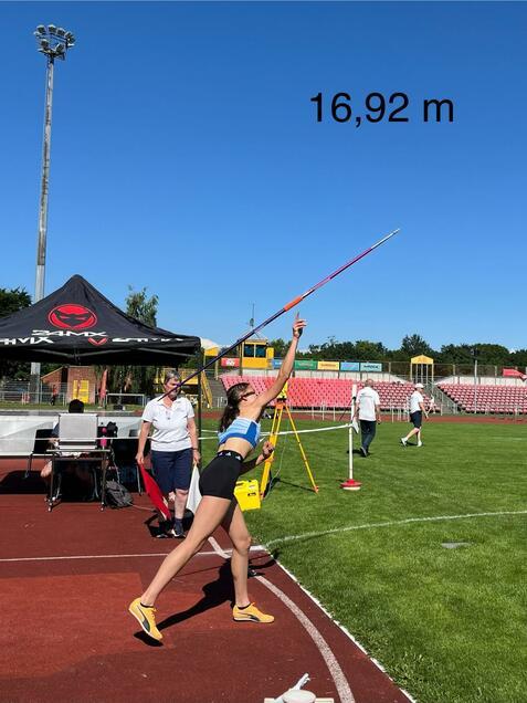 Der zweite Wettkampftag, Samstag, begann mit dem Weitsprung. Hier kam Lina auf sehr gute 4,93 Metern, was persönliche Saisonbestleistung war. In einem starken Feld war Lina zwischenzeitlich auf Platz 6 der Gesamtwertung. Die vorletzte Disziplin war der Speerwurf, die Disziplin, die Lina in den letzten Wochen sicher am meisten trainiert hat, weil es nicht ihre Paradedisziplin ist. Mit 21,26 Metern jedoch hatte Lina nicht nur eine sehr gute Leistung, sondern auch eine neue persönliche Bestleistung geworfen. Abschluss des Wettkampfs war der 800 Meter Lauf, den Lina in einer sehr guten Zeit von 2:33,50 Minuten beendete. Am Ende belohnte sich Lina Harjes mit 3489 Punkten in ihrem zweiten Mehrkampf überhaupt, mit dem 12. Platz bei einer DM und einer neuen persönlichen Bestleistung.
