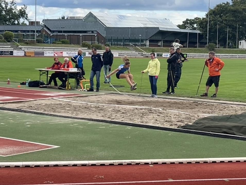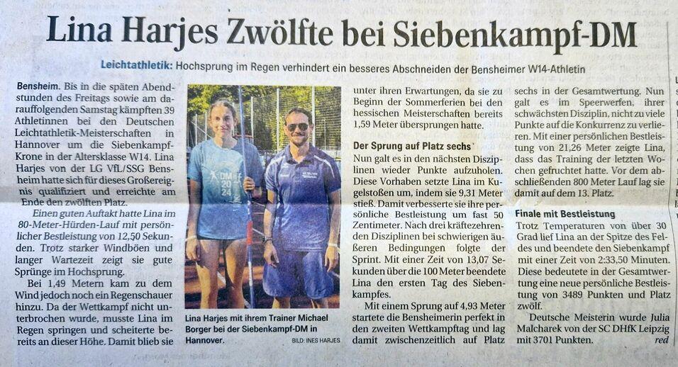 Am Wochenende vom 23.08. bis 25.08.2024 wurden die Deutschen Meisterschaften der Mehrkämpfer und Mehrkämpferinnen in Hannover ausgetragen. Die LG Athletin Lina Harjes hatte sich für diese Meisterschaften Anfang Juli qualifiziert und startete beim Siebenkampf der Weiblichen Jugend W14. Berits am Freitag standen mit 80 Meter Hürden, Hochsprung, Kugelstoßen und der 100 Meter Sprint die ersten vier Disziplinen auf dem Programm.