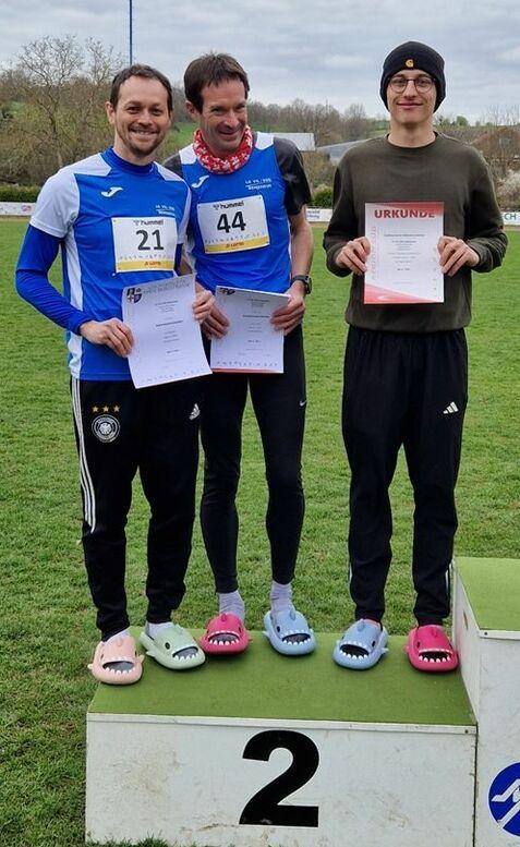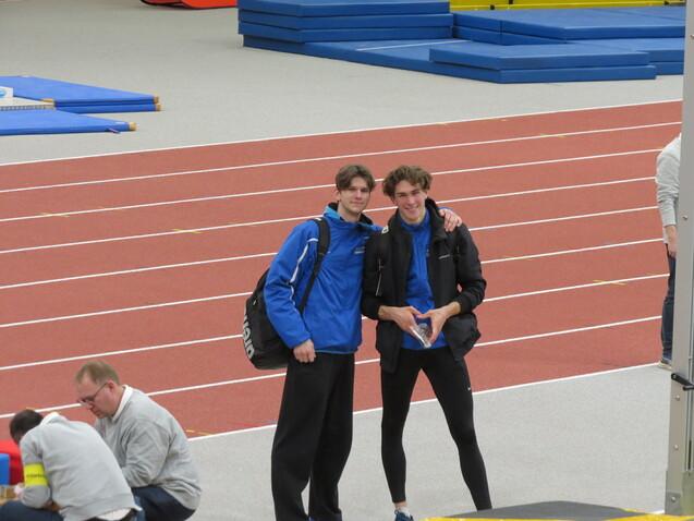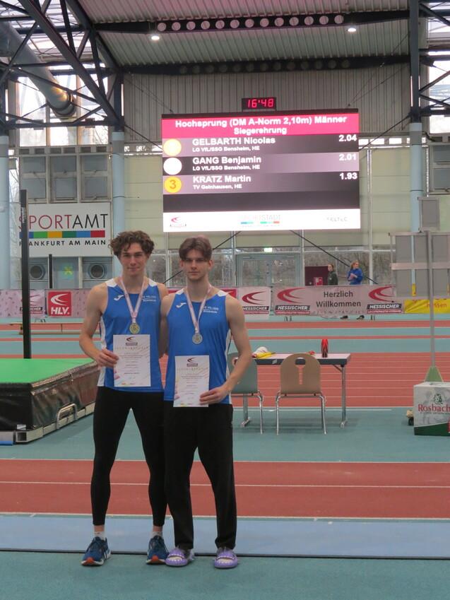 Das Highlight aus Sicht der LG VfL SSG Bensheim, war sicher der Hochsprung der Männer. Hier waren dann die Hochspringer Benjamin Gang und Nicolas Gelbarth am Start. Aufgrund des wenigen Hochsprungtrainings und mangels Wettkämpfe, vor allem in der Halle, entschieden sich beide Springer schon bei einer Höhe von 1,80 m in das Finale einzusteigen. Bereits bei einer Höhe von 1,85 m stand fest, dass Benni und Nico mit einer Medaille nach Hause gehen würden, da die Konkurrenz entweder bereits ausgeschieden war oder verletzt aufgeben musste. Nico und Benjamin setzten sich aufgrund der geringeren Fehlversuche an die Spitze, wobei Nicolas weniger Fehlversuche als Benjamin hatte. Bei der Höhe von 1,97 m waren die beiden Bensheimer dann unter sich und sprangen um Gold und Silber. Bis 2,01 war Nico auf Platz 1 und Benjamin auf Platz 2. Die 2,01 übersprang Benjamin im zweiten Versuch und Nicolas im dritten. Jetzt hatte Benjamin die Nase vorn. Die nächste Höhe war dann 2,04 m. Diese übersprang Nicolas in seinem dritten Versuch während Benjamin knapp scheiterte. Damit war die Entscheidung gefallen. Nicolas versuchte noch die 2,06 m, aber die waren nach zwölf Sprüngen nicht mehr machbar. Am Ende standen die beiden Freunde Benjamin und Nicolas wieder gemeinsam an der Spitze des Feldes auf dem Podest.