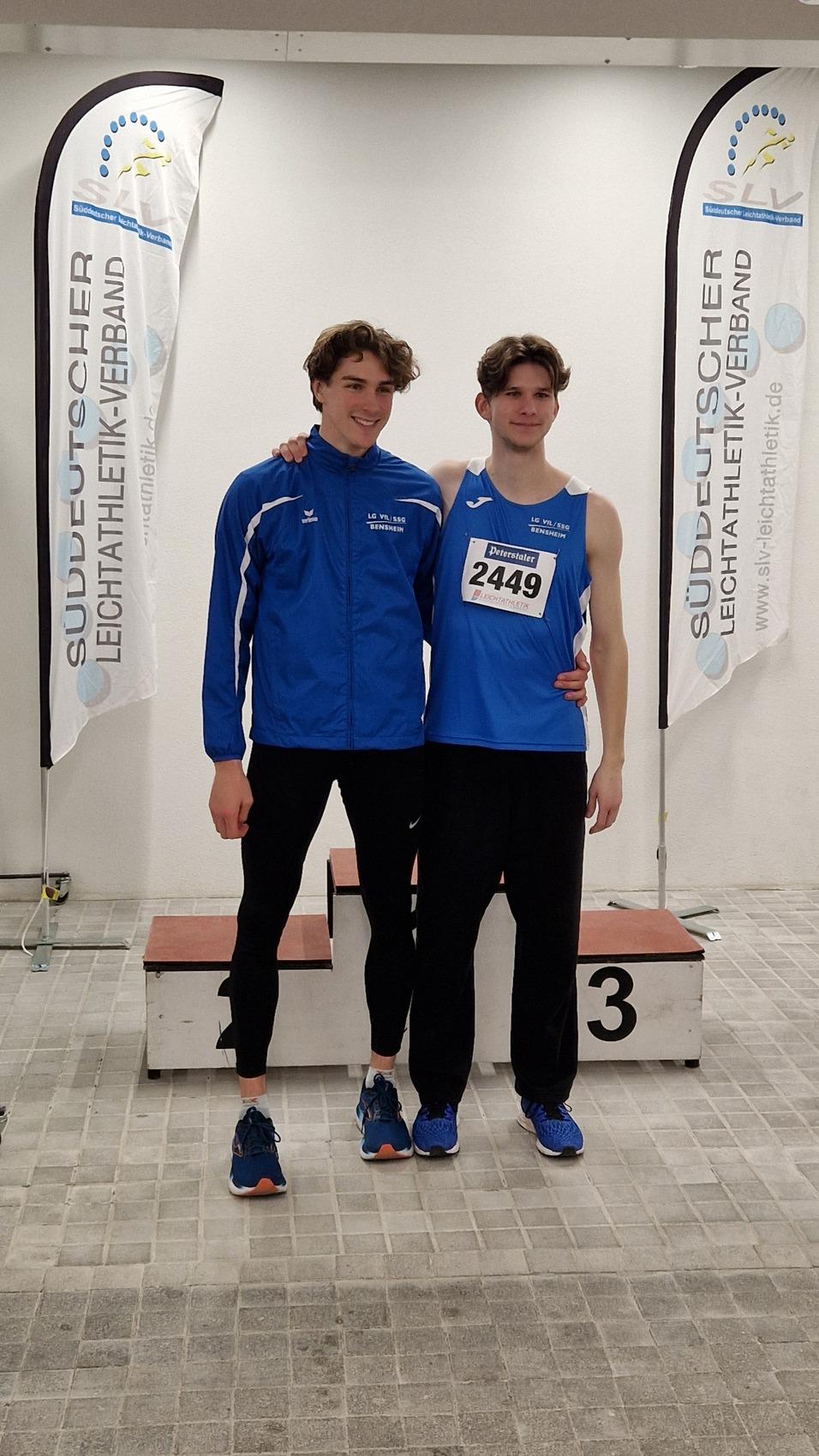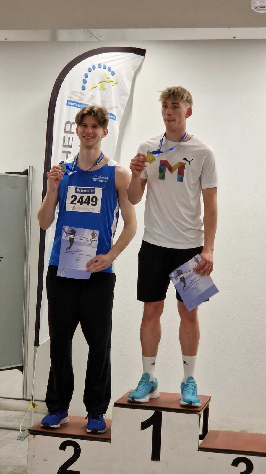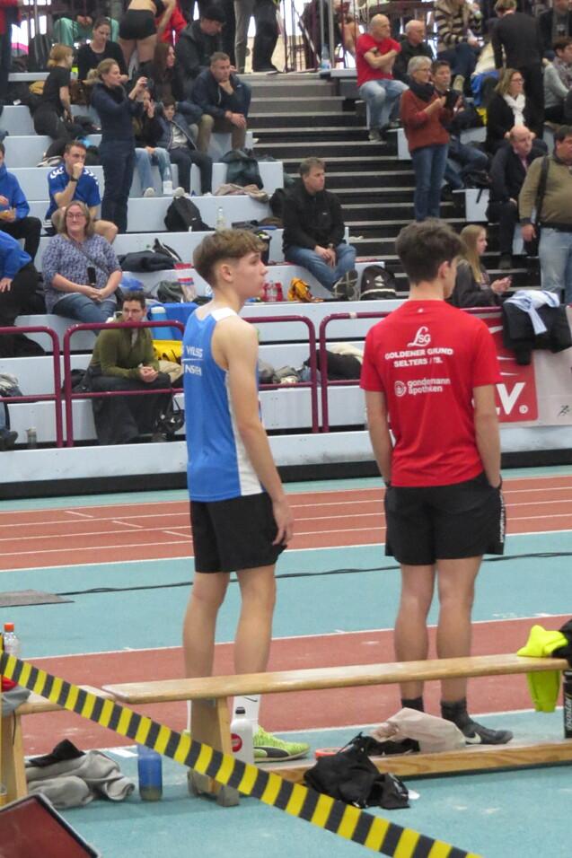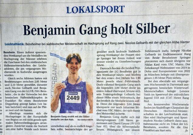 Die Anfangshöhe von 1,85 m war dann für Benjamin und Nicolas kein Problem. Unter der Konkurrenz allerdings hatte der eine oder andere bereits die ersten Fehlversuche. Auch die 1,90m und 1,95m waren keine Hürde für die Bensheimer Springer. Dagegen hatten andere Springer bereits ihre Probleme oder waren aus dem Wettkampf ausgeschieden. Neben Benjamin und Nicolas versuchten sich dann noch fünf weitere Springer über die 2 Meter Marke. Benjamin war gleich als zweiter Springer an der Reihe und meisterte die Höhe erneut im ersten Versuch. Sein Freund und Vereinskamerad Nicolas gelang es leider nicht im ersten Versuch. Während Nicolas die Höhe locker im zweiten Versuch schaffte, waren die 2 Meter für andere an diesem Tag eine zu große Höhe. Auch der Olympiateilnehmer Niklas Kaul musste die Segel streichen. Bei der nächsten Höhe von 2,04m waren dann noch Benjamin, Nicolas und drei weitere Springer im Wettbewerb. In allen drei Versuchen über die 2,04m scheiterten sowohl Benjamin, als auch Nicolas nur knapp. Für beide Springer wären die 2,04m an diesem Tag allerdings möglich gewesen. Einzig Johannes Böcher vom USC Mainz gelang es die 2,04 m zu überspringen, was ihm den Titel des Süddeutschen Meisters einbrachte. Aufgrund keiner Fehlversuche bis 2,04 sicherte sich Benjamin Gang gemeinsam mit Charel Gaspar den zweiten Platz. Ärgerlich war es für Nicolas Gelbarth, der wegen des Fehlversuchs über 2,00 m den Wettbewerb auf dem vierten Platz beendete. Ärgerlich auch deshalb, weil es aufgrund von zwei zweiten Plätzen keinen dritten Platz gab. Dennoch waren die Bensheimer Hochspringer Nicolas Gelbarth und Benjamin Gang erneut erfolgreich. Trainer Markus Forster gab nachher zu Bedenken, dass auch hier unsere Springer fast keine Möglichkeiten für ein Hallentraining im Hochsprung haben und die Erfolge daher viel höher zu bewerten sind als die der Konkurrenz, die teilweise perfekte Trainingsmöglichkeiten hat.