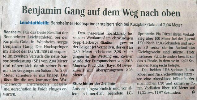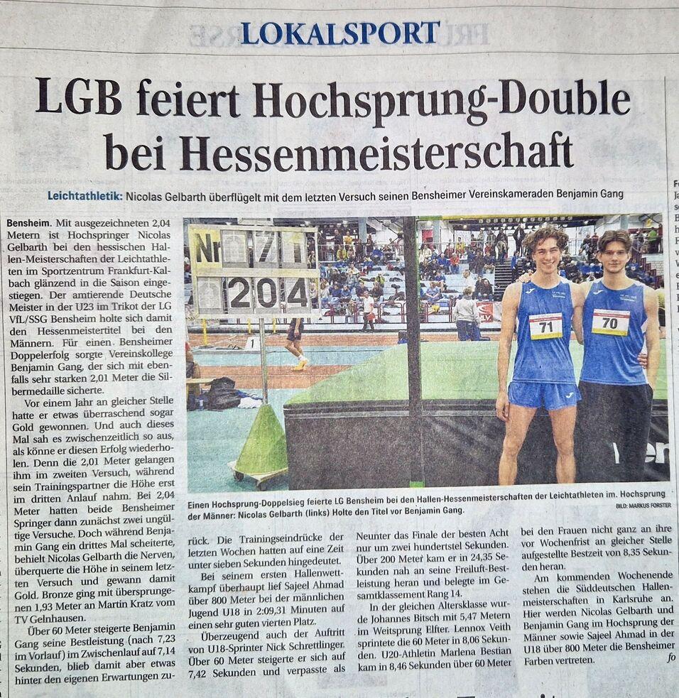 Neben den Hessischen Meisterschaften im Winterwurf, fand an diesem Wochenende ein weiteres Highlight dieser Hallensaison statt. Der Badische Leichtathletikverband richtete in der Europahalle in Karlsruhe die Süddeutschen Hallenmeisterschaften aus. Für die LG VfL/SSG Bensheim gingen die beiden Hochspringer Benjamin Gang und Nicolas Gelbarth an den Start. Im Hochsprung der Männer erwartete die beiden Bensheimer eine schwere Aufgabe. Die Konkurrenz war mit 13 gemeldeten Athleten groß. Unter den gemeldeten waren nicht nur Springer, die bereits die 2,10 Meter übersprungen hatten, es war auch der frühere Zehnkampf Weltmeister Niklas Kaul am Start, was den Wettbewerb auch für die Zuschauer nochmal interessanter machte.