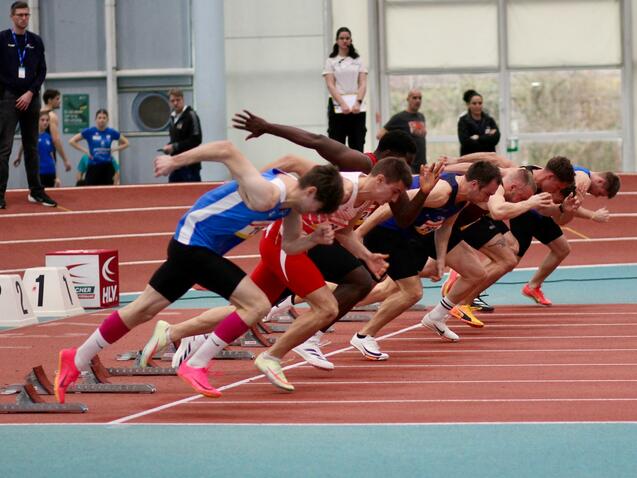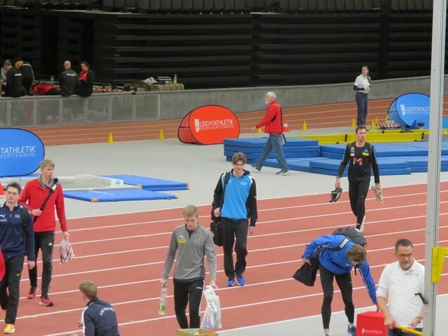 Nach den Frauen kamen die Männer. Hier brauchte es sogar sieben Vorläufe um unter den 54 Teilnehmern die besten 24 zu finden. Im dritten Vorlauf sprintete Benjamin Gang mit 7,23 Sek in den Zwischenlauf. Die Erleichterung über das Erreichen des Zwischenlaufs war groß, denn Benjamin „verschlief“ ein wenig den Start. Durch die Qualifikation für den Zwischenlauf, hatte Benjamin eine weitere Chance seine Zeit zu verbessern. Und Benjamin nutzte seine Chance. Mit sehr guten 7,14 Sek verbesserte er seine pB über die 60 Meter. Die Zeit reichte zwar nicht fürs Finale, aber ein 18. Platz im Sprint für einen Hochspringer ist aller Ehren wert.