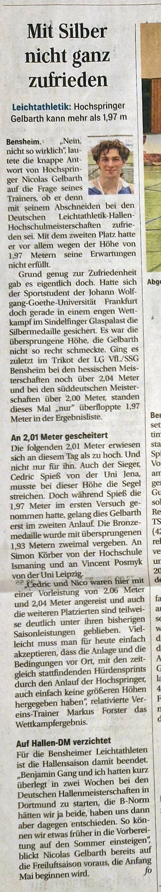 Der Deutsche Hochschulverband veranstaltete am Samstag, den 08. Februar 2025 die Deutschen Hochschulmeisterschaften im Glaspalast in Sindelfingen. Mit dabei war Hochspringer Nicolas Gelbarth. Der Athlet der LG VfL SSG Bensheim ging dieses Mal für die Johann Wolfgang Goethe-Universität Frankfurt an den Start an der Nicolas studiert. Nico stieg bei der Höhe von 1,85 m ein und übersprang die ersten drei Höhen im ersten Versuch. Bei 1,97 m leistete sich Nico leider einen Fehlversuch. Da sein Konkurrent Cedric Spieß, von der Uni Jena, diese Höhe im ersten Versuch übersprang und beide Athleten an der nächsten Höhe von 2,01 m scheiterten, war dieser Fehlversuch umso ärgerlicher, denn er kostete Nico den möglichen Titel. In der Endabrechnung durfte sich Nicolas über den Vizemeister-Titel freuen.