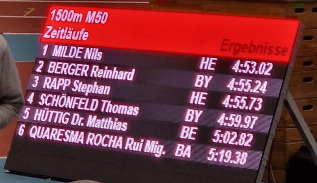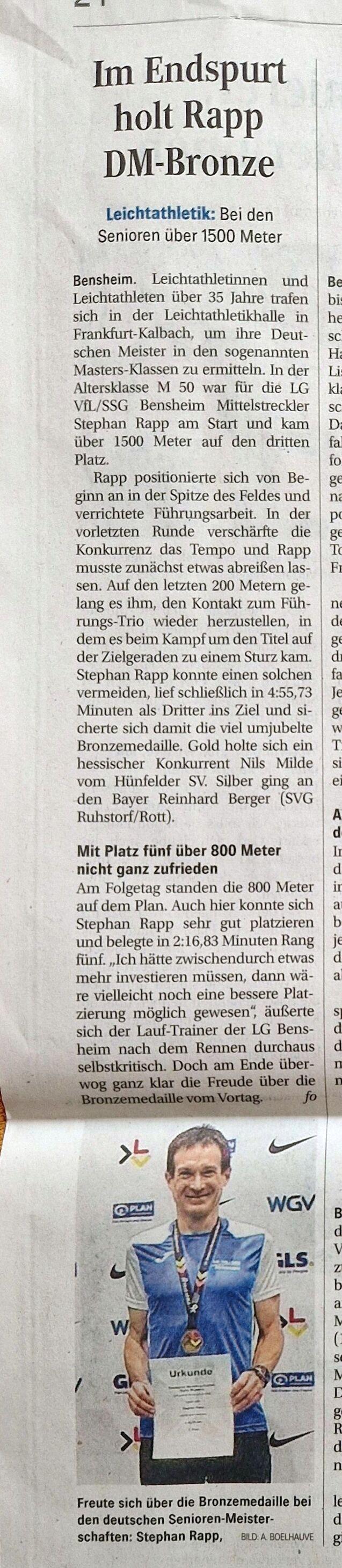 Einziger Starter der LG VfL SSG Bensheim war Stephan Rapp. Stephan startete am Samstagabend zur besten Zeit um 20:10 Uhr über die 1.500 Meter. Nach dem Start setzte sich Stephan Rapp an die Spitze des Feldes. Lange war Stephan vorne und machte die Führungsarbeit. In der vorletzten Runde verschärften die Läufer Nils Milde (Hünfelder SV), Reinhard Berger (SVG Ruhstorf/Rott) und Miguel Rui Quaresma Rocha (TSV 05 Rot) das Tempo und Stephan fiel auf den (undankbaren) vierten Platz zurück. Es dauerte einige Meter bis Stephan wieder in die Nähe der Ausreißer heran gelaufen war, doch an ein Überholen war nicht zu denken, dazu waren die Läufer zu schnell. Allerdings kämpften Milde und Quaresma Rocha so stark um den Sieg, dass es zu einem Sturz von Letzterem, nur wenige Zentimeter, vor der Ziellinie kam. So kam der Läufer und Trainer der LG VfL SSG Bensheim Stephan Rapp mit einer Zeit von 4:55,73 Minuten zu einem mehr als verdienten dritten Platz. Nach dem Rennen war Stephan überglücklich und freuet sich über den Gewinn der Bronze Medaille.