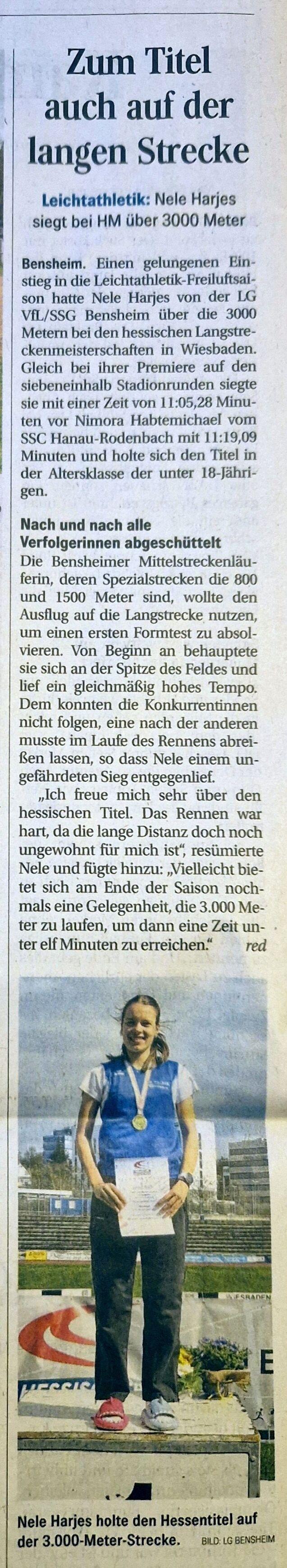 Langstreckenmeisterschaften in Wiesbaden. Gleich bei ihrer Premiere auf den siebeneinhalb Stadionrunden siegte sie mit einer Zeit von 11:05,28 Minuten vor Nimora Habtemichael vom SSC Hanau-Rodenbach mit 11:19,09 Minuten und holte sich den Titel in der Altersklasse der unter 18-Jährigen. Die Mittelstreckenläuferin, deren Spezialstrecken die 800 und 1500 Meter sind, wollte den Ausflug auf die Langstrecke nutzen, um einen ersten Formtest zu absolvieren. Von Beginn an konnte sie sich an der Spitze des Feldes behaupten und ein gleichmäßig hohes Tempo laufen. Diesem konnten die Konkurrentinnen nicht folgen und eine nach der anderen mussten im Laufe des Rennens abreißen lassen, so dass Nele einem ungefährdeten Sieg entgegenlief. „Ich freue mich sehr über den hessischen Titel! Das Rennen war hart, da die lange Distanz doch noch ungewohnt für mich ist. “ resümierte Nele und fügte hinzu: „Vielleicht bietet sich am Ende der Saison nochmals eine Gelegenheit die 3000 Meter zu laufen, um dann eine Zeit unter 11 Minuten zu erreichen.“ (Ines Harjes)