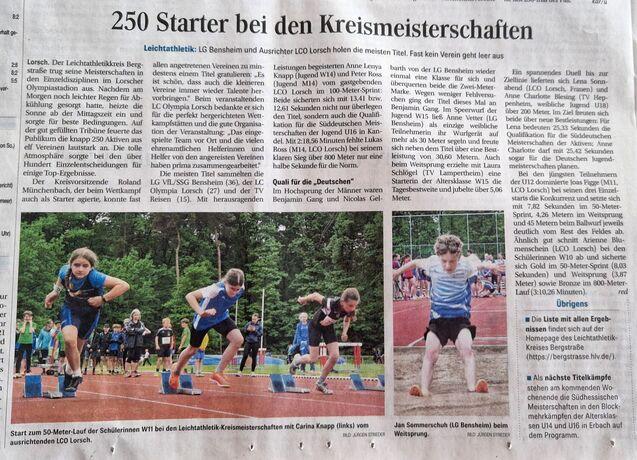 Am Sonntag den 23. Februar fanden in der Sporthalle in Frankfurt-Kalbach die offenen Kreis Hallenmeisterschaften des Leichtathletik-Kreises Hochtaunus statt. Aufgrund von Krankheit konnten die beiden Athletinnen Anne Vetter und Lina Harjes nur bedingt oder gar nicht bei den Hessischen Meisterschaften teilnehmen und nutzten die Möglichkeit am Sonntag in drei Disziplinen an den Start zu gehen. Beide Sportlerinnen starteten über die 60 Meter-Sprint-Strecke, den Weitsprung und im Kugelstoßen der Weiblichen Jugend U18 und erreichten folgende Resultate: 60 Meter Anne Vetter 8,20 (Vorlauf 1) Lina Harjes 8,07 (Vorlauf 3), sowie Anne 8,26 und Lina 8,04 (Finale). Im Weitsprung kam Anne auf 4,99 m und Lina 5,19 m. Im Kugelstoßen stieß Anne die 3-kg-Kugel auf 10,44 m und Lina auf 10,09 m. Betreut wurde die beiden Bensheimerinnen von Trainer Michael Borger.