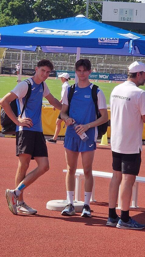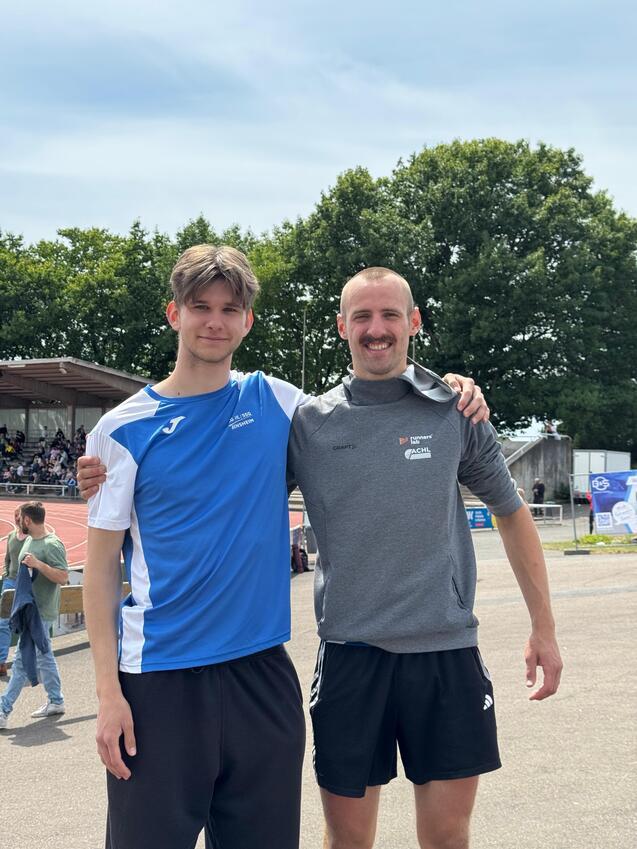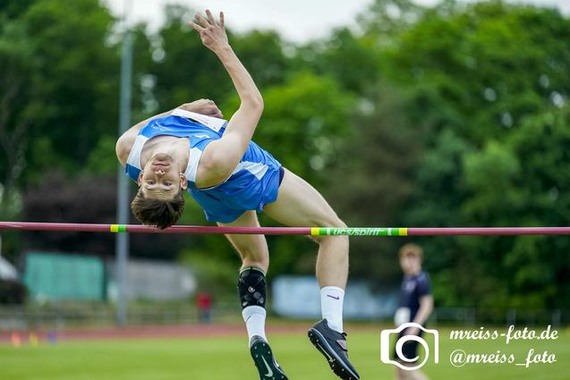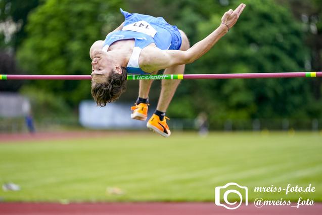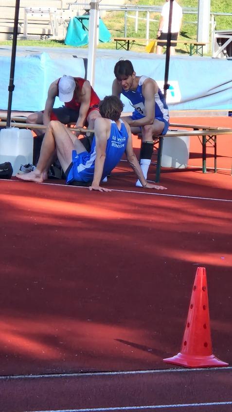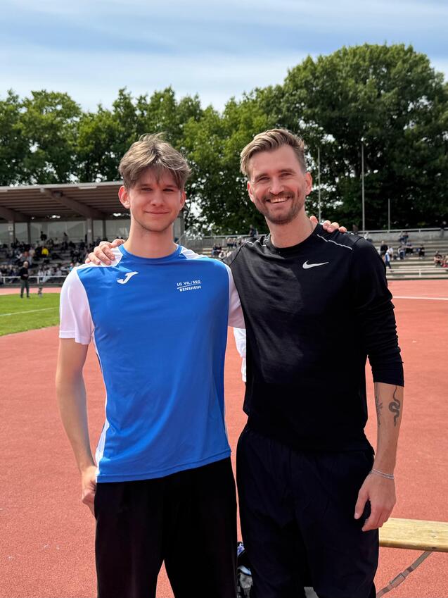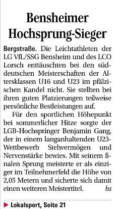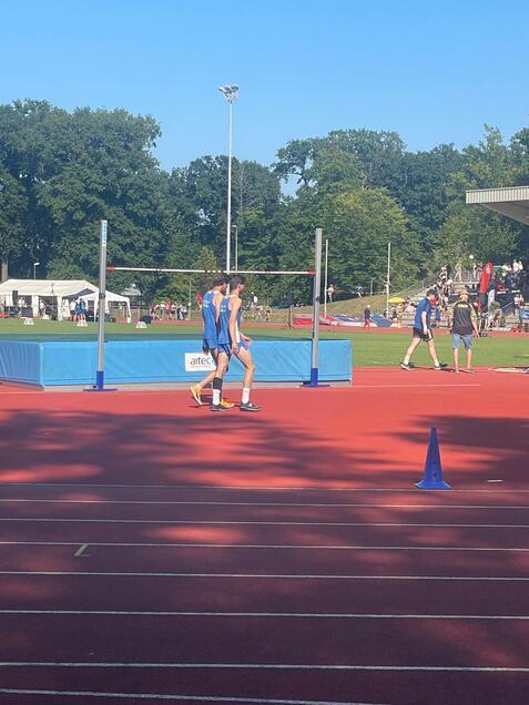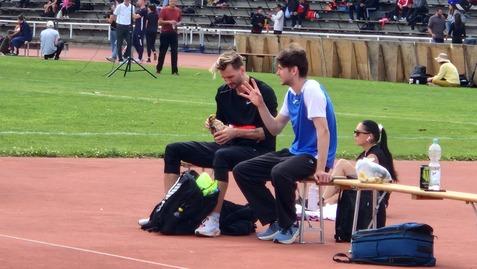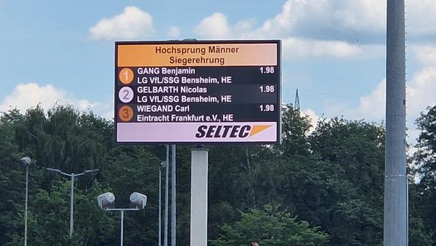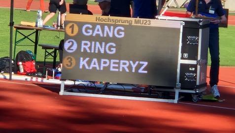 Um 16:30 Uhr begann der Wettkampf im Hochsprung der männlichen U23. Hier waren die Bensheimer Nicolas Gelbarth und Benjamin Gang gemeldet. Aufgrund ständiger Unterbrechungen und Fehler der Kampfrichter wusste man nicht, wie und wann dieser Wettkampf sein Ende finden würde. Nachdem der Wettkampf um eine Stunde nach hinten verschoben wurde, kollidierte er mit denLäufen über 1500 Meter, den 300/400 Meter Hürdenläufen und den Staffeln, sodass es zu ständigen Unterbrechungen kam. Nachdem Benjamin und Nico die ersten Höhen von 1,70, 1,75 m und 1,80 m ausgelassen hatten, stiegen beide bei 1,85 m in den Wettkampf ein. Die Höhen von 1,85 m und 1,90 m meisterten beide Springer im ersten Versuch. Bei 1,93 m erlaubten sich Nico und Benni ihren ersten Fehlversuch. Dann begann das Kampfgericht, falsche Namen bzw. eine andere Reihenfolge anzuzeigen. Auch lief die Uhr bereits, obwohl die Latte noch nicht auflag. Das alles gepaart mit ständigen Unterbrechungen führte zu Unruhe. Hier war unter anderem der Bensheimer Nicolas Gelbarth stark betroffen. Die 1,96 m schaffte Nico im zweiten Versuch, die 1,99 m im dritten Versuch, die 2,02 m leider nicht. Zu allem Unglück verletzte sich Nico beim letzten Sprung, zum Glück nur leicht. Anders Benjamin Gang: Er ließ sich nicht aus der Ruhe bringen und sprang die 1,96 m und 1,99 m im ersten Versuch. Bei 2,02 m waren noch sechs Springer im Wettkampf. Ein Springer brach den Wettkampf nach dem ersten Fehlversuch ab, einer schaffte es gleich im ersten Versuch und setzte sich an die Spitze des Feldes. Zwei weitere Springer, darunter auch Nicolas Gelbarth, schafften diese Höhe nicht, und Benjamin Gang erst im dritten Anlauf. Bei 2,05 m, der folgenden Höhe, riss der bis dahin Führende dreimal, während Benjamin diese Höhe im zweiten Versuch übersprang. Damit stand Benjamin als Süddeutscher Meister fest. Nachdem Nicolas Gelbarth diesen Titel 2024 gewonnen hatte, bleibt der Titel in Bensheim. Nachdem Benni mit Trainer Markus Forster Rücksprache gehalten hatte, versuchte er noch die 2,09 m. Diese wäre eine neue persönliche Bestleistung und Qualifikationshöhe für die DM in Dresden gewesen, aber Benni scheiterte dreimal sehr knapp. Für Nico war es am Ende ein fünfter Platz, höhengleich mit dem Drittplatzierten.
