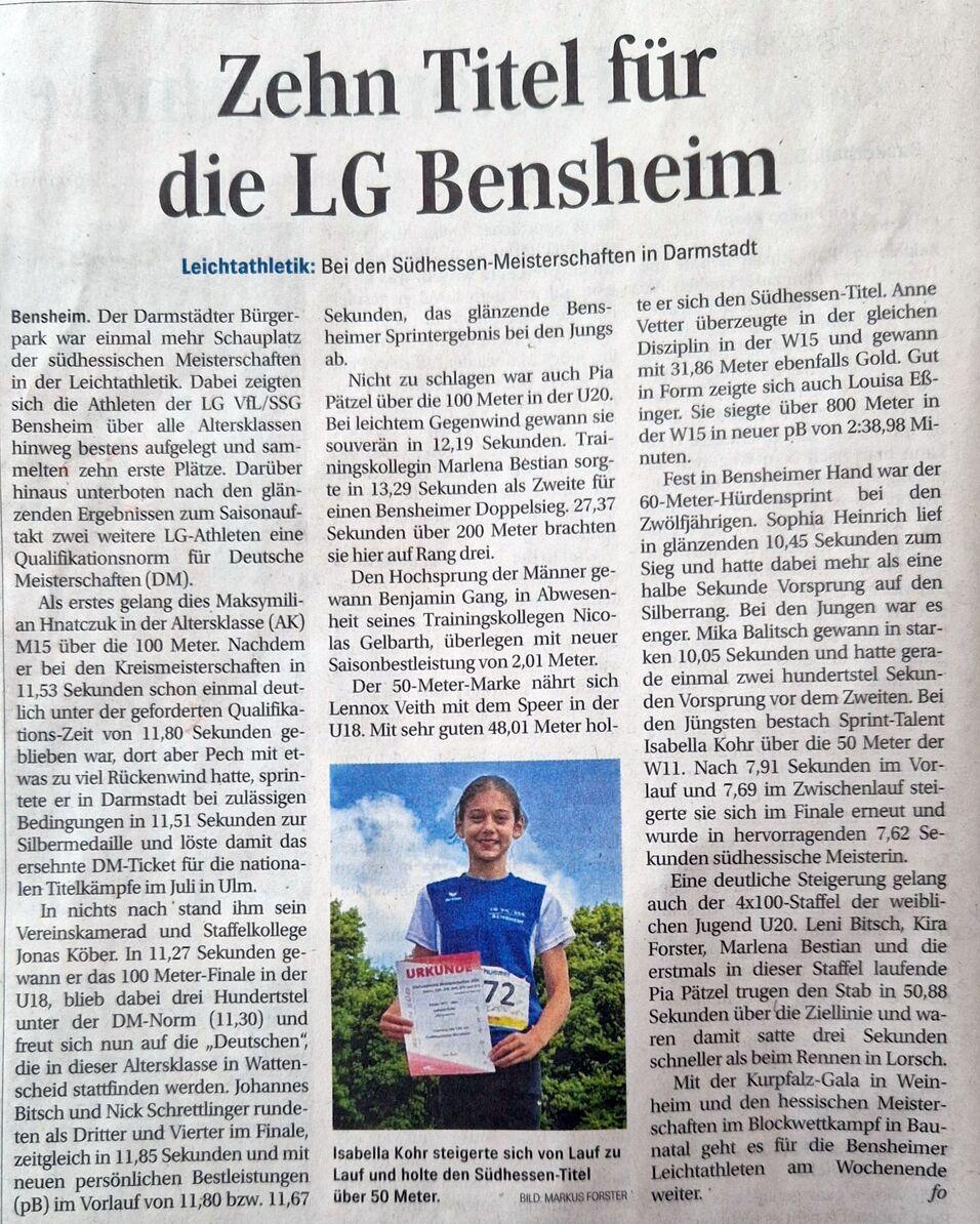 Am Ende bleibt festzuhalten, dass die Athletinnen und Athleten der LG VfL/SSG Bensheim mit Neun Athletinnen/Athleten viermal Gold und je einmal Silber und Bronze gewannen. Dazu noch ein sehr guter Platz 4 und ein Sprinter unter den besten Acht in Hessen. Eine Bilanz mit der das Trainertem um Markus Forster sicher sehr zufrieden ist.