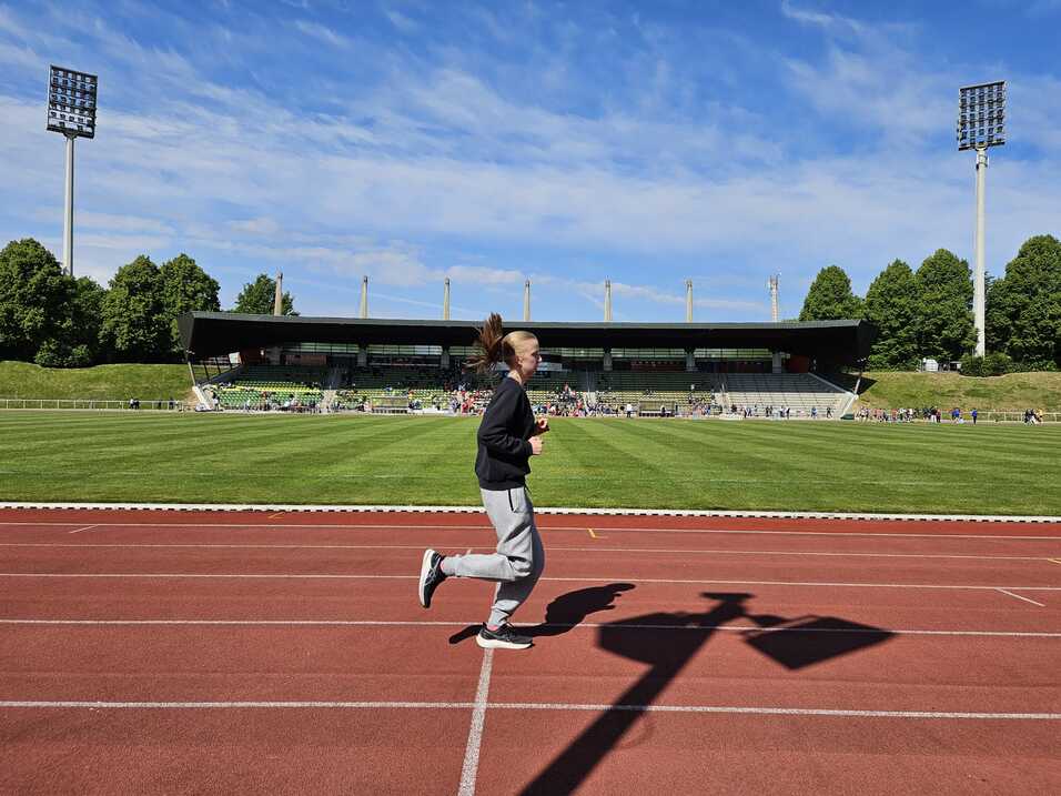 Erste Starterin am Sonntag war Louisa Eßinger über 2000 Meter der W15. Vernünftigerweise fanden diese Läufe gleich am Vormittag um 10:45 Uhr statt, denn so entging man der größten Hitze des Tages. Für Louisa galt es, sich möglichst gut zu verkaufen und ein gutes Rennen zu laufen, denn es war Louisas erste Teilnahme an einem so großen Wettkampf. Die Qualifikation dafür hatte sie bei ihrem Lauf bei den Blockmehrkämpfen geschafft. Und Louisa lief ein sehr gutes Rennen. Mit einer neuen persönlichen Bestleistung und einem guten Platz 17 hatte Louisa einen starken Wettkampf abgeliefert.