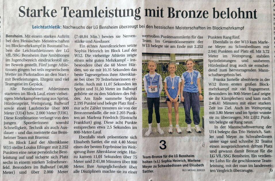 Die Veranstaltung begann um 10:00 Uhr mit dem Wettkampf der Kinder unter 8 Jahren (U8). Hier schickte die LG Bensheim keine Mannschaft ins Rennen. Um 12:00 Uhr begann dann der Team Wettkampf der U12 und die LG VfL SSG Bensheim startete hier gleich mit zwei Mannschaften. Für das Team ‚LG Bensheim – Die Falken‘ gingen Carla Stemann, Charlotte Sattler, Henri Schumacher, Eric Thyssen, Sebastian Belzner, Luise Fritsche, Tizian Beck, Luca Eßinger, Lucas Pfeifer und Lena Novak an den Start. Für das zweite Team, ‚LG Bensheim – Die Sharkys‘, waren Luke Busse, Daniel Ulrich, Isabella Kohr, Ole Harjes, Ferdinand Ströhle, Emil Konrad, Vito Neph, Helena Lahr und Juna Winter im Einsatz. Beide Mannschaften gaben ihr Bestes für ein gutes Team-Ergebnis. In den Disziplinen Sprint (35 Meter), Weitsprung, Medizinballstoßen (2kg) und einer Hindernisstaffel, sammelten die Sportlerinnen und Sportler Punkte. Besonders zu erwähnen ist die Leistungsdichte in den Läufen der Hindernisstaffel. Zwischen Platz 1 und Platz 8 liegen nur wenige Sekunden bzw. Zentimeter. Hier errangen die 'Sharkys' den ersten Platz. In der Endabrechnung freute man sich dann über einen sehr guten zweiten Platz der ‚Sharkys‘ und einen ebenfalls sehr guten sechsten Platz der ‚Falken‘. Im Wettkampf waren immerhin zwölf Mannschaften aus sieben Vereinen.