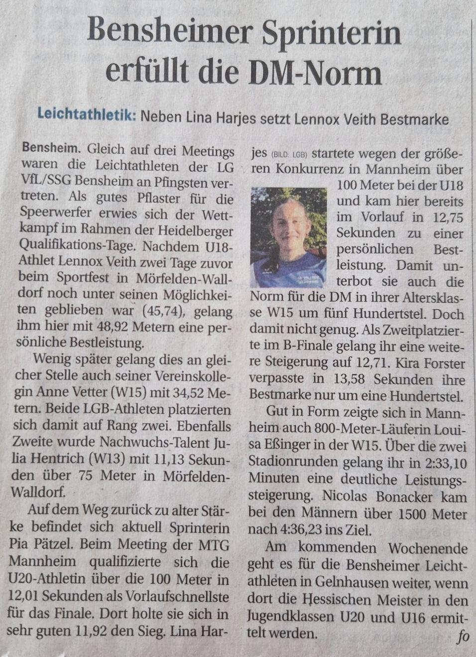 Am Pfingstwochenende standen gleich mehrere Wettkämpfe an, bei denen Athletinnen und Athleten der LG VfL/SSG Bensheim am Start waren. In solchen Wettkämpfen gilt es sich auf große Wettkämpfe, wie eine Deutsche Meisterschaft, vorzubereiten oder sich dafür zu qualifizieren. Aber auch um neue persönliche Bestleistungen anzustreben. So waren Trainerinnen und Trainer vom Trainerteam um Markus Forster wieder unterwegs um die Sportlerinnen und Sportler zu betreuen.