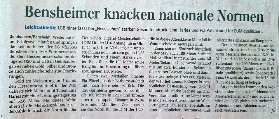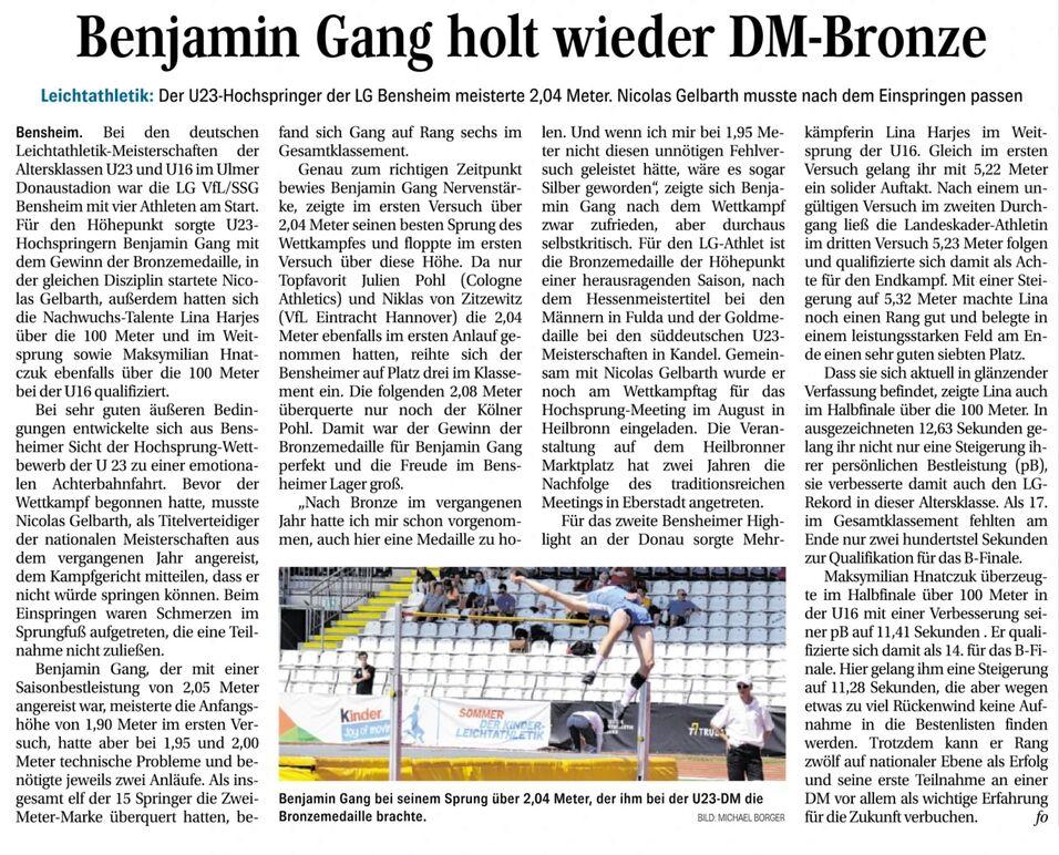 Am ersten Wochenende im Juli fanden im Donaustadion zu Ulm die Deutschen Meisterschaften der Jugend U16 und U23 statt. Die LG VfL/SSG Bensheim freut sich über die Qualifikation von Lina Harjes (U16 Weitsprung, 100 m), Benjamin Gang (U23 Hochsprung), Nicolas Gelbarth (U23 Hochsprung) und Maksymilian Hnatczuk (U16 100 m), die in Ulm an den Start gingen.
