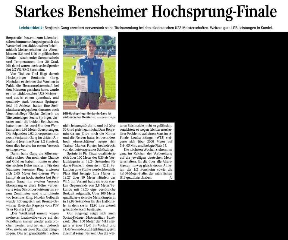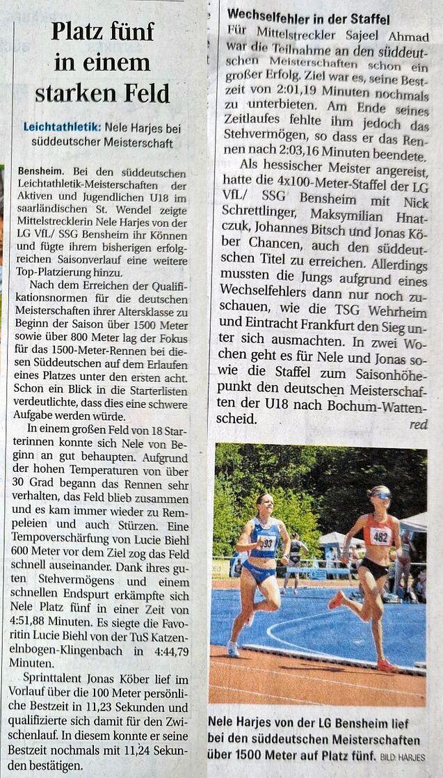 Der letzte große Wettbewerb vor den Deutschen Meisterschaften fand am letzten Juni Wochenende in St. Wendel statt. Die Süddeutschen Meisterschaften der Aktiven und Jugendlichen U18 wurden bei hochsommerlichen temperaturen im Saarland ausgetragen. Mit am Start waren mehrere Athletinnen und Athleten der LG VfL/SSG Bensheim. Bei Temperaturen weit über 30° C durfte man gespannt sein, ob überhaupt neue Bestleistungen möglich sein würden.