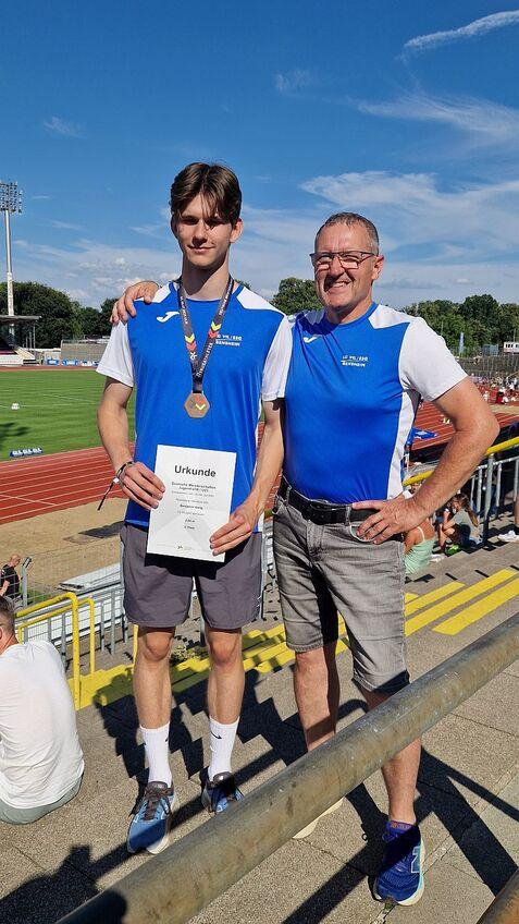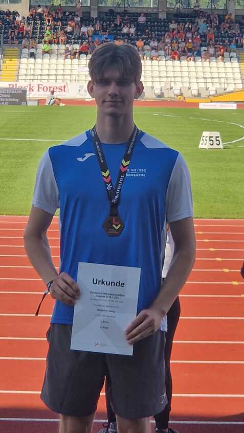 Am frühen Nachmittag waren dann die beiden Hochspringer Nicolas Gelbarth und Benjamin Gang an der Reihe. Für beide Athleten war es nach 2023 die zweite Teilnahme an einer Deutschen Meisterschaft. Nachdem beide Springer ihren Anlauf ausgemessen hatten, begann das Einspringen. Hier musste Nicolas feststellen, dass seine Verletzung, mit der er bereits seit ein paar Wochen zu kämpfen hatte, erneut aufgebrochen war und ihm die Teilnahme am Wettkampf dadurch leider nicht möglich war. So war es nur Benjamin, der die LG Bensheim vertrat. Aber Nico ließ es sich nicht nehmen, den Wettkampf im Innenraum zu verfolgen und Benjamin zu unterstützen. Die Einstiegshöhe von 1,90 m schafften alle Springer. Bei 1,95 m hatten bereits einige Springer Fehlversuche, auch Benjamin. Bei 2,00 Metern waren bereits die ersten Springer ausgeschieden, was der Spannung aufgrund der Leistungsdichte und Klasse in diesem Wettbewerb allerdings keinen Abbruch tat. Benni schaffte dann die 2,00 Meter im zweiten Versuch. Waren bei der Höhe von 2,00 Metern noch elf Athleten im Wettkampf, waren es bei der nächsten Höhe von 2,04 Metern immerhin noch sechs Springer. Bei der Höhe von 2,04 zeigte Benni seinen an diesem Tag besten Sprung. Gleich im ersten Versuch knackte er diese Höhe und setzte sich kurzzeitig an die Spitze des Feldes. Im ersten Versuch sprangen nur noch Julien Pohl und Niklas von Zitzewitz über diese Höhe, sodass Benjamin zu diesem Zeitpunkt auf dem Bronzerang lag, da alle weiteren Konkurrenten diese Höhe im zweiten oder sogar erst im dritten Anlauf übersprangen. Die folgende Höhe von 2,08 Metern übersprang Julien Pohl in seinem zweiten Versuch und verteidigte damit seine Spitzenposition. Benjamin war als erster aller Springer an der Reihe und musste immer vorlegen. Nachdem er, wie alle seine Konkurrenten, im ersten und zweiten Versuch die 2,08 m riss, lag er noch immer auf Platz drei. Auch im dritten Versuch – Benjamins bester Versuch über diese Höhe – gelang es ihm leider nicht, die 2,08 m zu überspringen. Jetzt war Warten angesagt. Mit jedem Springer, der nach Benjamin diese Höhe im dritten Versuch riss, rückte die mögliche Medaille näher. Als der letzte Springer, Keon Schmidt-Gothan, auch an 2,08 m scheiterte, war die Bronzemedaille für Benjamin sicher. Die Freude bei Trainer Markus Forster und Benjamin über den dritten Platz bei dieser DM war riesig. Selbst die Tatsache, dass der Fehlversuch über 1,95 m eine mögliche Silbermedaille gekostet hatte, trübte die Freude über Platz drei in keiner Weise.