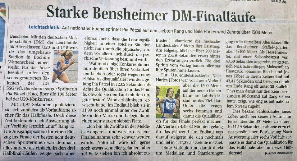 Drei Tage lang war das traditionsreiche Lohrheidestadion in Bochum-Wattenscheid Schauplatz der Deutschen Jugendmeisterschaften in den Altersklassen U18 und U20 – und bot damit den besten Nachwuchs-Leichtathletinnen und -Leichtathleten Deutschlands eine große Bühne. Mit dabei: ein engagiertes und hochmotiviertes Team der LG VfL/SSG Bensheim, das sich mit insgesamt sechs Aktiven für diese hochklassige Veranstaltung qualifiziert hatte. Für Pia Pätzel, Jonas Köber, Nele Harjes, Nick Schrettlinger, Johannes Bitsch und Maksymilian Hnatczuk war die Teilnahme an den nationalen Titelkämpfen nicht nur ein sportlicher Höhepunkt des Jahres, sondern auch eine wertvolle Erfahrung auf höchstem Niveau. Und die jungen Athletinnen und Athleten nutzten die Gelegenheit, ihr Können unter Beweis zu stellen – mit persönlichen Bestzeiten, Finalplatzierungen und Vereinsrekorden.