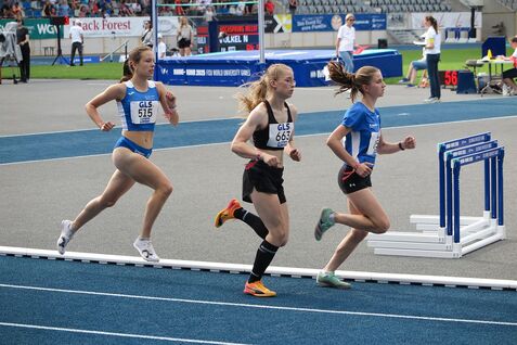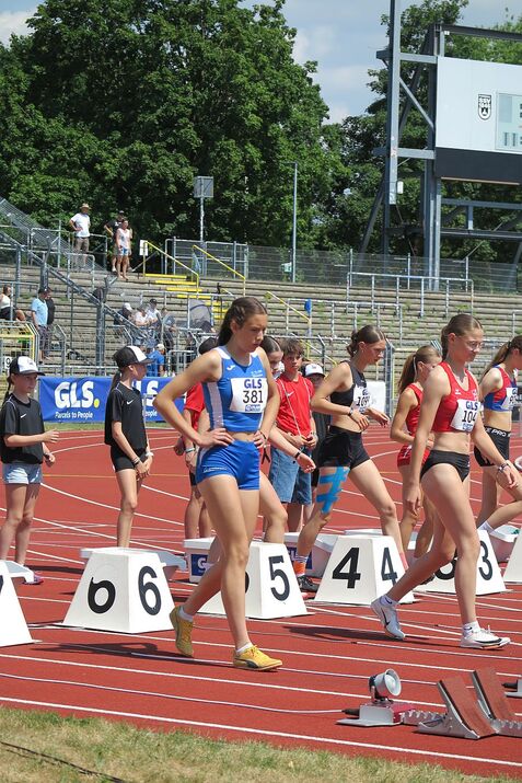 Erste Starterin am Sonntag war Louisa Eßinger über 2000 Meter der W15. Vernünftigerweise fanden diese Läufe gleich am Vormittag um 10:45 Uhr statt, denn so entging man der größten Hitze des Tages. Für Louisa galt es, sich möglichst gut zu verkaufen und ein gutes Rennen zu laufen, denn es war Louisas erste Teilnahme an einem so großen Wettkampf. Die Qualifikation dafür hatte sie bei ihrem Lauf bei den Blockmehrkämpfen geschafft. Und Louisa lief ein sehr gutes Rennen. Mit einer neuen persönlichen Bestleistung und einem guten Platz 17 hatte Louisa einen starken Wettkampf abgeliefert.
