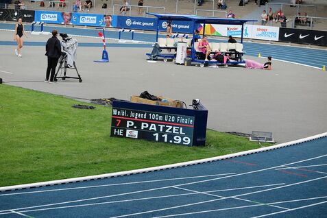 Sprinterin Pia Pätzel ging in der Mittagshitze über die 100 Meter der weiblichen U23 an den Start. Pia gewann zwar ihren Lauf und zog ins A-Finale ein, war aber mit der gelaufenen Zeit nicht so zufrieden. Im Finale konnte Pia ihre Vorlaufzeit unterbieten und erreichte mit einer Zeit von 12,21 Sekunden an diesem heißen Nachmittag einen guten fünften Rang.