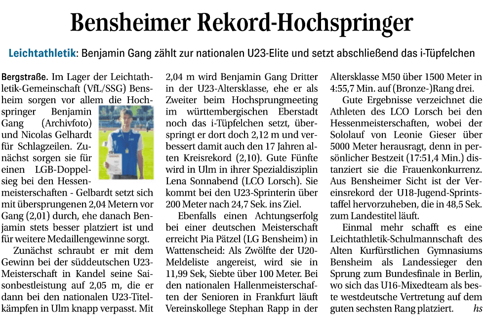 Die konstant guten Leistungen spiegeln sich eindrucksvoll in den nationalen und hessischen Bestenlisten wider. Insgesamt verzeichnete die LG VfL/SSG Bensheim 28 Platzierungen unter den Top 50 der deutschen Bestenlisten. Besonders hervorzuheben sind hierbei unter anderem Benjamin Gang (Hochsprung), Nele Harjes (Mittelstrecke), Lina Harjes (Mehrkampf), Sajeel Ahmad (Mittelstrecke) sowie unsere erfolgreichen Sprint- und Staffelteams.