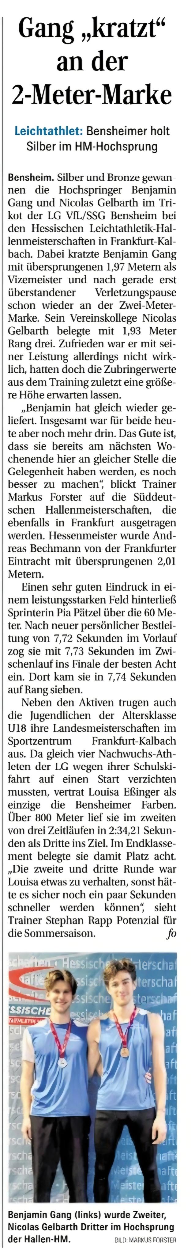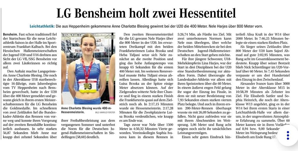 Der erste Meisterschaftswettkampf des neuen Jahres waren die Hessischen Hallenmeisterschaften der Jugend U20 und U16. Ausgerichtet wurden die Wettkämpfe von den Leichtathleten von Eintracht Frankfurt in der Sporthalle Frankfurt-Kalbach. Auch die LG VfL/SSG Bensheim war an diesem Wochenende mit einigen Athletinnen und Athleten vertreten.