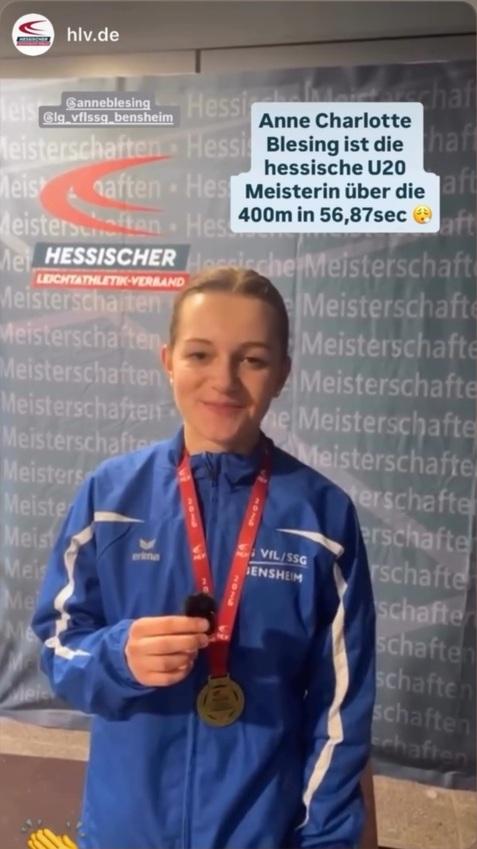 Den Abschluss des Samstags bildeten die 400 Meter, die Paradedisziplin von Anne Blesing. Auch Anne (Jahrgang 2009) wurde in die WU20 hochgemeldet. Sie startete im zweiten und schnelleren Lauf, in dem auch die Gesamtsiegerin ermittelt wurde. Nach zwei Runden in der Halle lief Anne in 56,87 Sekunden als Erste über die Ziellinie und sicherte sich damit den Titel der Hessischen Meisterin.