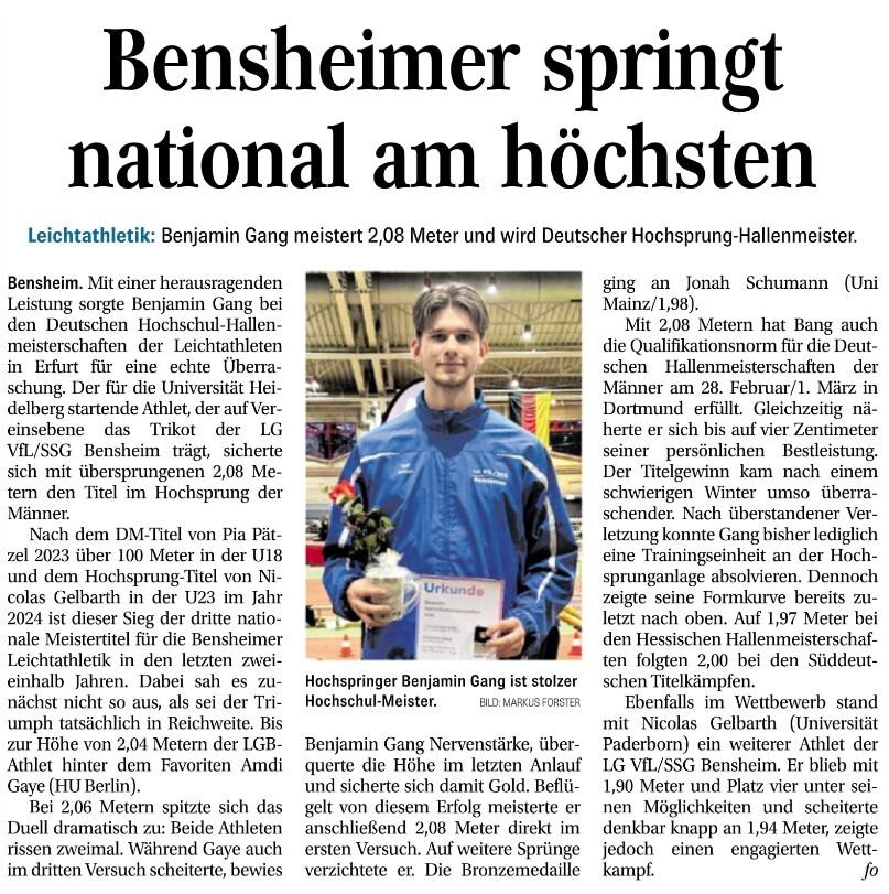 Am Samstag, dem 14.02.2026, richtete der USV Erfurt die diesjährigen Deutschen Hochschulmeisterschaften in der Hartwig-Gauder-Halle aus. Mit den beiden Hochspringern Nicolas Gelbarth und Benjamin Gang standen auch zwei Athleten der LG VfL/SSG Bensheim am Start. Nicolas trat für die Universität Paderborn an, Benjamin für die Universität Heidelberg.
