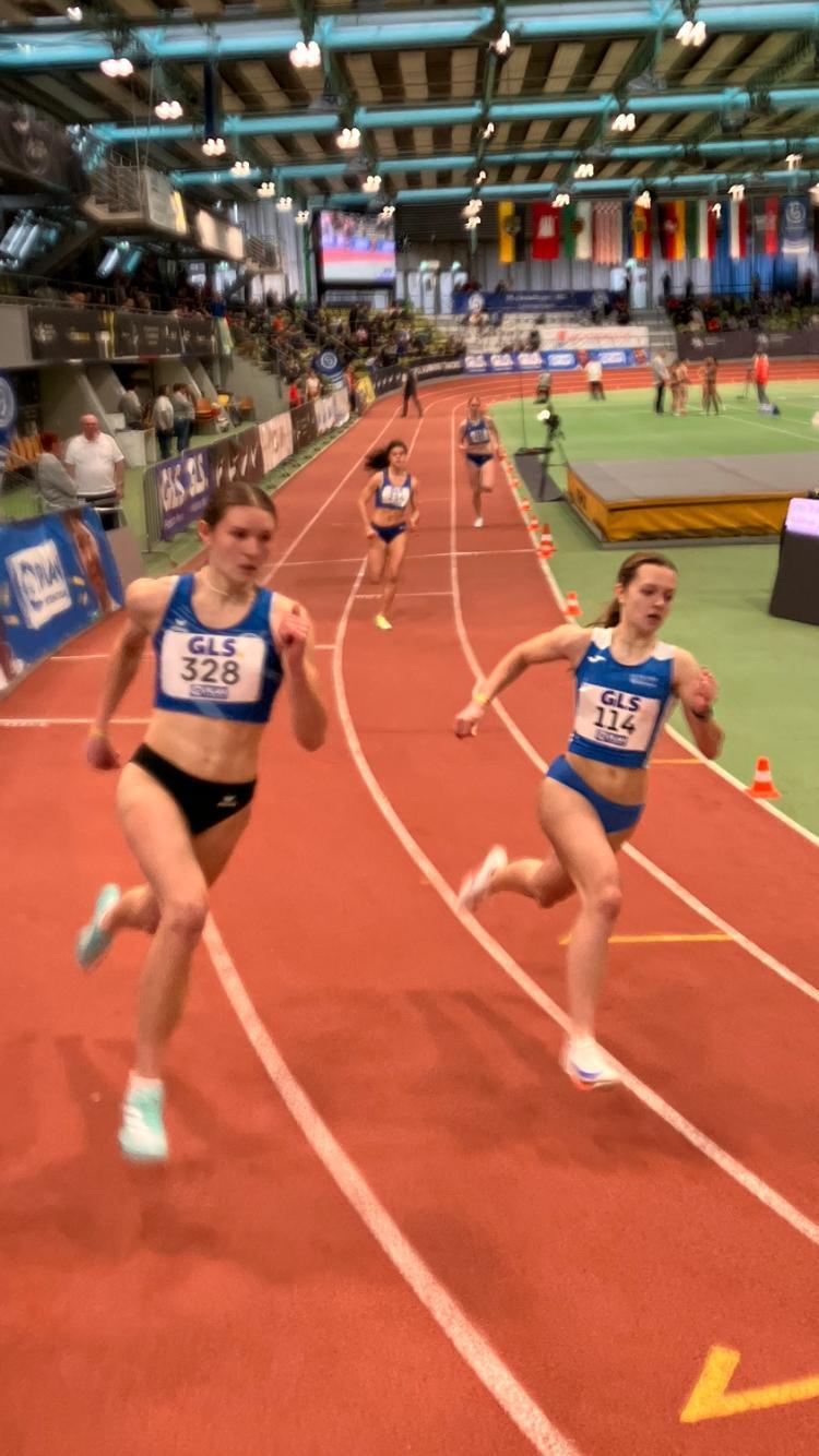 Am Samstag ging es für Anne Charlotte Blesing und Lina Harjes um gute Zeiten in den Vorläufen über 60 Meter der weiblichen U18. In acht Vorläufen qualifizierten sich die acht Laufersten sowie die 16 Zeitschnellsten für die Zwischenläufe. Gleich im ersten Lauf waren die beiden Bensheimerinnen am Start. In einer sehr guten Zeit von 7,74 Sekunden konnte sich Anne Blesing als Lauferste direkt qualifizieren. Für Lina Harjes, Dritte ihres Laufs, wurden 8,04 Sekunden gestoppt, sodass zunächst das Ende der verbleibenden sieben Vorläufe abgewartet werden musste. Nach rund 15 Minuten stand fest, dass sich auch Lina als eine der 16 Zeitschnellsten für die Zwischenläufe qualifiziert hatte. In den Zwischenläufen wurden Lina und Anne erneut in denselben Lauf eingeteilt und mussten im dritten Zwischenlauf an den Start. Hier gelang es Anne, sich in 7,68 Sekunden als Zweite direkt für das Finale zu qualifizieren. Lina war mit 8,07 Sekunden nur unwesentlich langsamer als im Vorlauf, für den Einzug ins Finale reichte es jedoch leider nicht. Im Finale konnte Anne ihre persönliche Bestleistung nochmals auf 7,65 Sekunden verbessern und verpasste als sehr gute Vierte das Podium nur um Sekundenbruchteile. Zu Platz drei fehlten lediglich 0,02 Sekunden, zu Platz zwei 0,03 Sekunden. Betreut wurden die Athletinnen von den Trainern Markus Forster und Michael Borger.