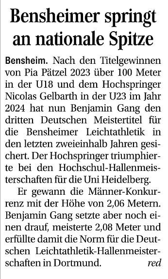 Am Samstag, dem 14.02.2026, richtete der USV Erfurt die diesjährigen Deutschen Hochschulmeisterschaften in der Hartwig-Gauder-Halle aus. Mit den beiden Hochspringern Nicolas Gelbarth und Benjamin Gang standen auch zwei Athleten der LG VfL/SSG Bensheim am Start. Nicolas trat für die Universität Paderborn an, Benjamin für die Universität Heidelberg.
