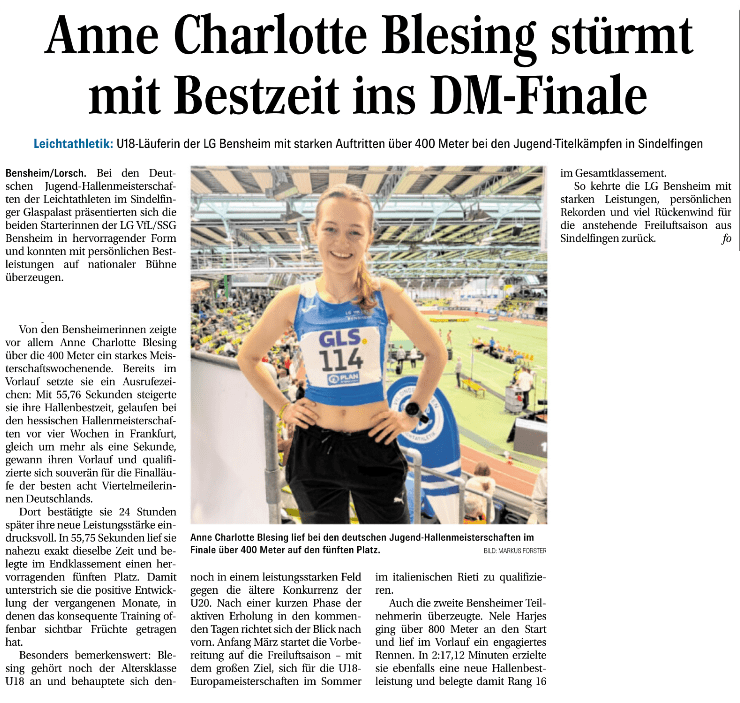 Die Deutschen Meisterschaften bilden den Höhepunkt der Hallensaison in der Leichtathletik. Den Auftakt machten am vergangenen Wochenende die Sportlerinnen und Sportler der Jugend U20 in Sindelfingen. Mit am Start waren zwei Athletinnen der LG VfL/SSG Bensheim, die sich aufgrund ihrer Leistungen qualifiziert hatten: Nele Harjes über 800 Meter sowie Anne Charlotte Blesing über 400 Meter. Beide mussten am Samstag in den angesetzten Halbfinalläufen antreten.