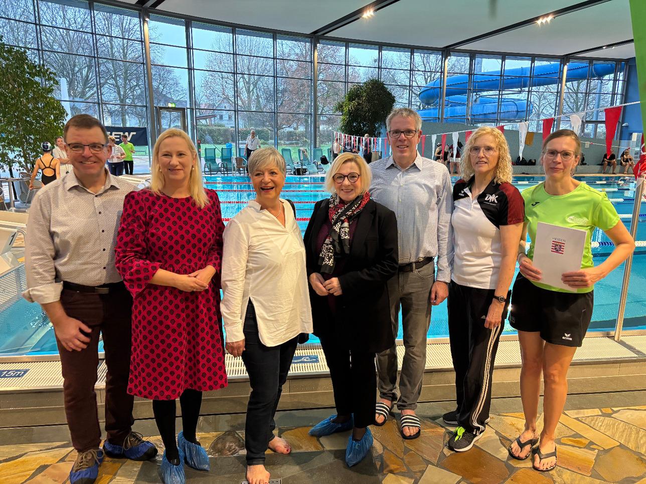 Die Ministerin Stolz würdigte die wichtige Arbeit der Schwimmvereine und überreichte Manuela Schneider, einer der beiden Abteilungsleiterinnen Schwimmen der SSG Bensheim, eine Zuwendung von 500 Euro für die Vereinsarbeit. - Ministerin Stolz: „Die DJK-Bundesjahrgangsmeisterschaften zeigen eindrucksvoll, was den Leistungssport im Schwimmen ausmacht: harte Trainingsarbeit, Disziplin und der Wettkampfgeist junger Athletinnen und Athleten. Gleichzeitig hält Schwimmen uns gesund, schafft Gemeinschaft und bietet vielen im Alltag einen wichtigen Ort der Begegnung. Mit unserem Förderprogramm SWIMplus unterstützen wir die Sanierung und die Steigerung der Attraktivität von Hallen- und Freibädern für Familien, Kinder und Senioren. Gut erreichbare und moderne Schwimmbäder sind wichtig für die Gesellschaft. Das zeigen hier heute die jungen Athletinnen und Athleten, die unsere große Anerkennung verdienen und die immer auch Vorbild für den Breitensport sind. Auch möchte ich mich für den beeindruckenden Einsatz der vielen Ehrenamtlichen, ohne die ein solches Event nicht möglich wäre, bedanken.“