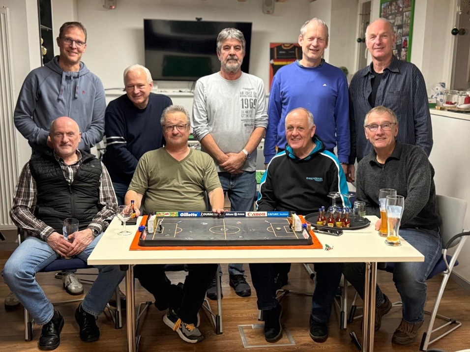 Zum TT-Rundenabschluss trafen sich auch in diesem Jahr einige Mitglieder der TT Abteilung der SSG zu einem Turnier mit den kleinen Tipp-Kick Fußballspielern. Die Anfänge für das Spiel liegen bei vielen der Spieler Jahrzehnte zurück: wöchentlich wurde von Messdienern und KJGlern beim Tipp-Kick Spiel im Pfarrhauskeller der Meister ermittelt. Neben dem damaligen Pfarrer Battenfeld tat sich auch der anwesende „Mecki“ Hübner bei den Meisterschaftsspielen besonders hervor. Favorisiert waren also auch in diesem Jahr wieder „Mecki“ Hüber sowie der Vorjahresfinalist Thomas Hunger. Schon in der Vorrunde trafen beide aufeinander und hier konnte Mecki das Spiel mit 6:3 für sich entscheiden. Nach Halbfinalsiegen kam es zu einem erneuten Aufeinandertreffen. Nun hatte Thomas Hunger mit einem klaren 8:3 die Nase vorn und löst damit den zweifachen „Titelträger“ Mecki Hübner ab. Den Abschluss bildete wie immer eine gesellige Runde mit Diskussionen über „Farbenglück“, Spielermaterial und gelungenen Spielzügen.