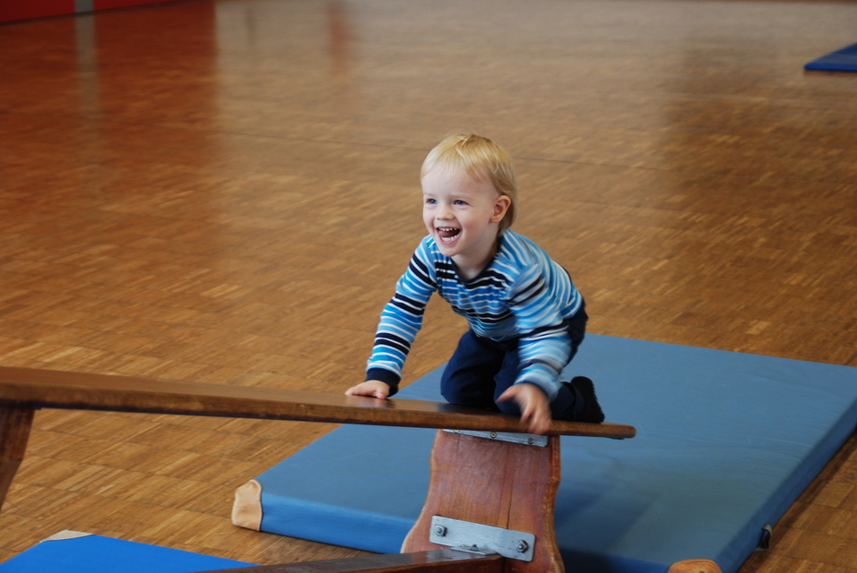 Alle wichtigen Bewegungsformen in diesem Alter werden geschult: Krabbeln, Laufen, Balancieren, Rutschen, Kriechen, Klettern, Steigen, sich Ziehen usw.! Wir nutzen sowohl alle Großgeräte der Halle wie auch Kleingeräte, also Bälle, Reifen, Stäbe, Säckchen usw. , wir spielen aber auch mit Alltagsmaterialien wie Plastikbechern, Korken, Kastanien…